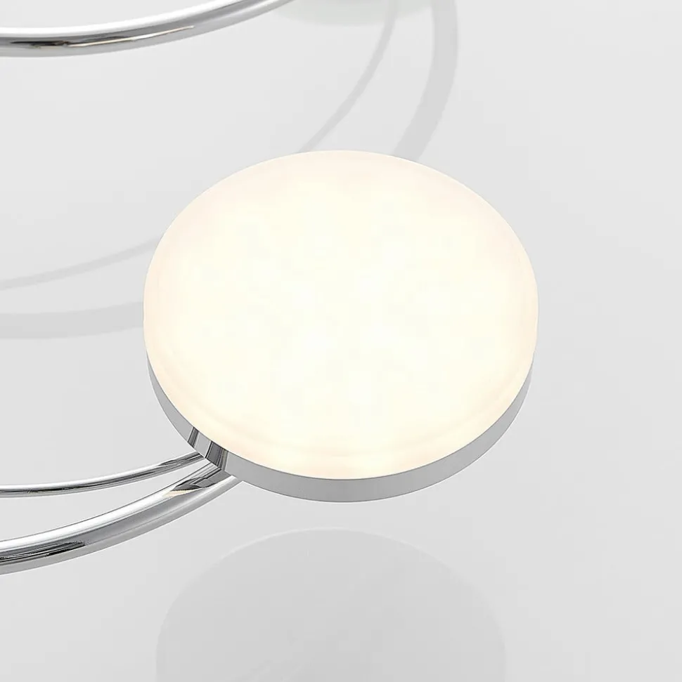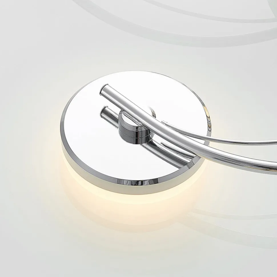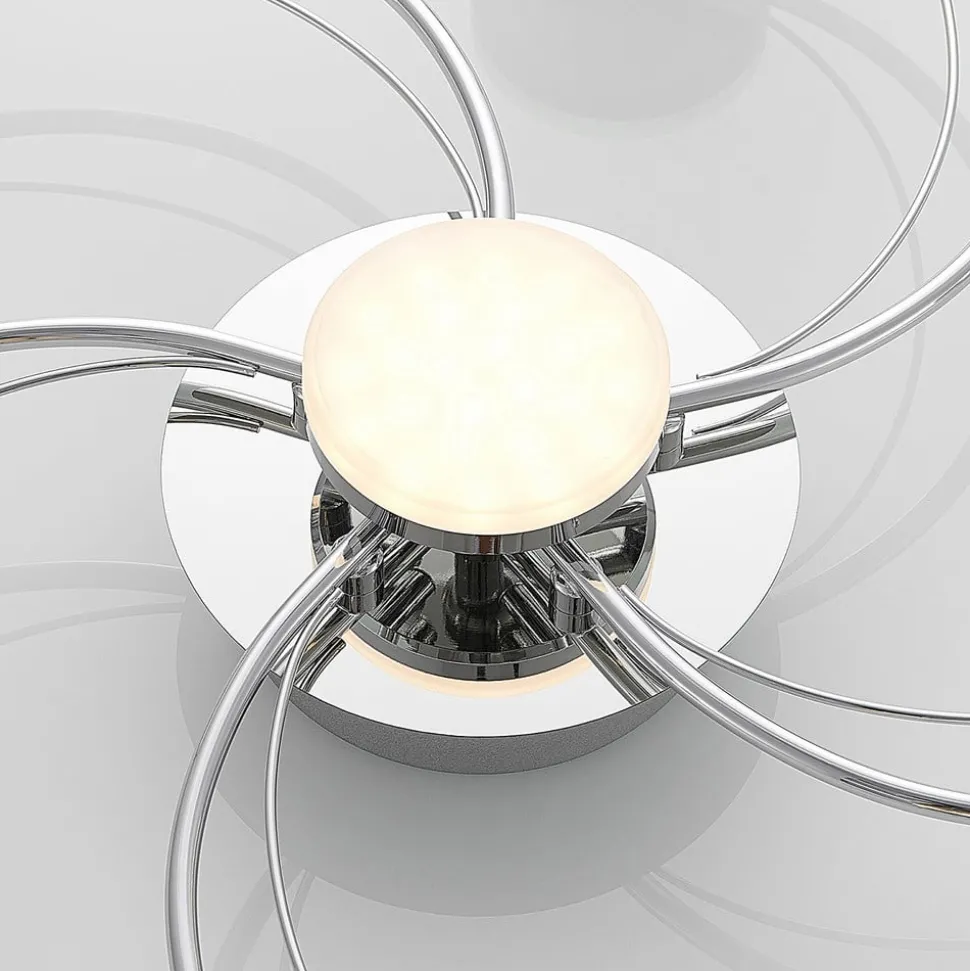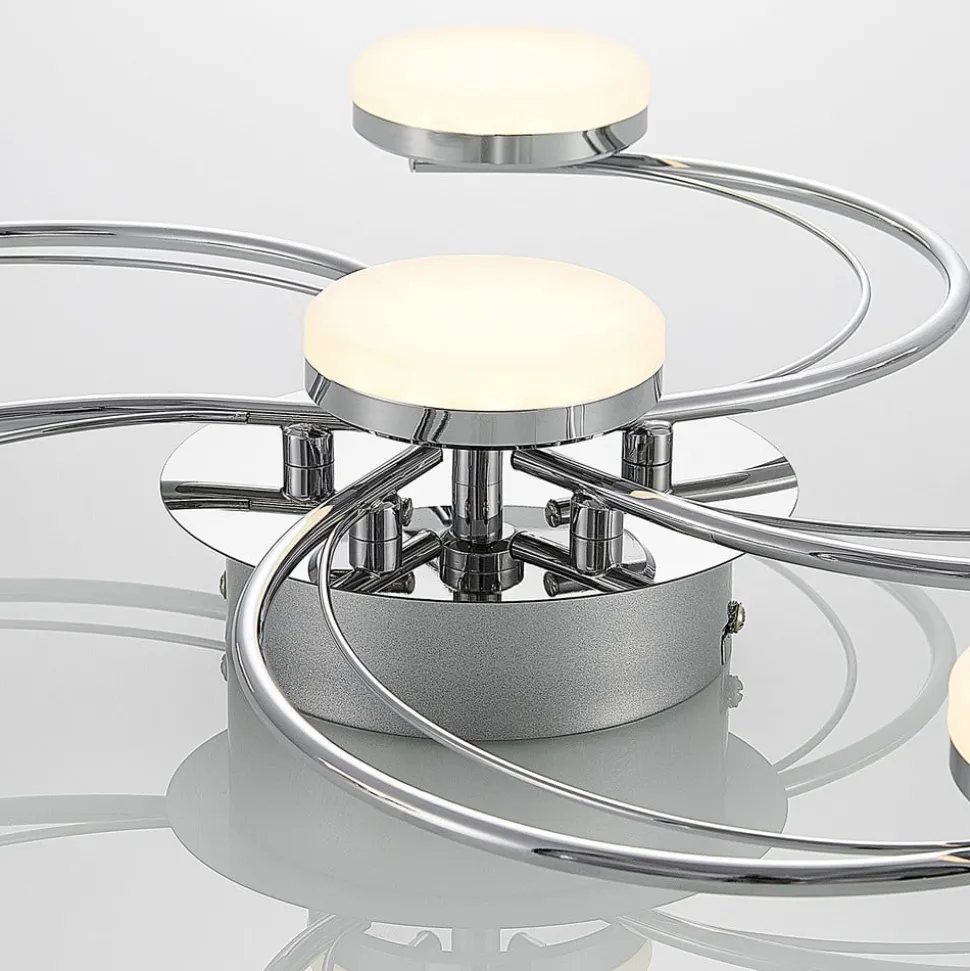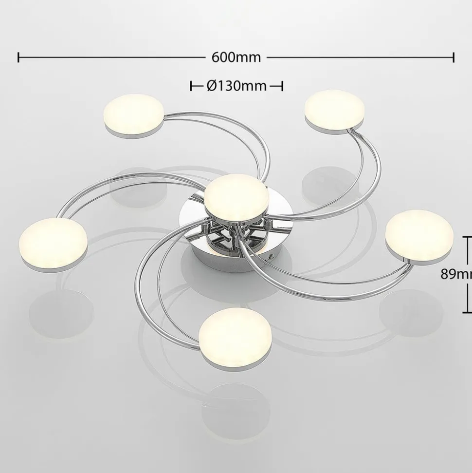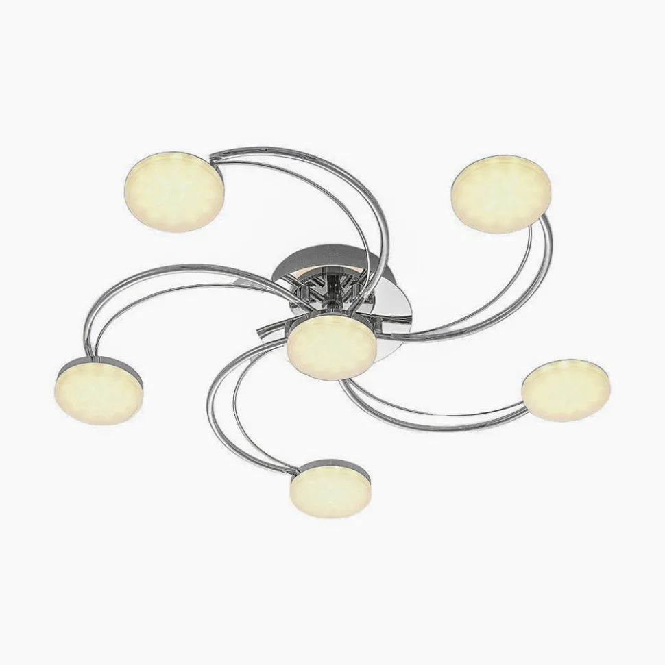 Rouven LED plafondlamp met een mooie spiraalvormige look voor heldere verlichting Rouven is een moderne LED plafondlamp die bestaat uit vijf gebogen metalen staven. Deze zijn gerangschikt in een spiraal en afgewerkt in een mooie chroomkleur. De LED’s bevinden zich achter ronde, gesatineerde kappen aan het uiteinde van de metalen staven. Omdat een spiraal klassiek rond is, vult de ronde vorm van de afdekkingen het concept van de armatuur perfect aan. De vormen harmoniëren met elkaar en creëren een prachtig totaalbeeld. Tegelijkertijd wordt er een aangenaam warm licht in de ruimte uitgestraald, dat dankzij de hoge lumenoutput helder genoeg is om grotere ruimtes gelijkmatig te verlichten. Rouven is ideaal voor een moderne woonkamer.