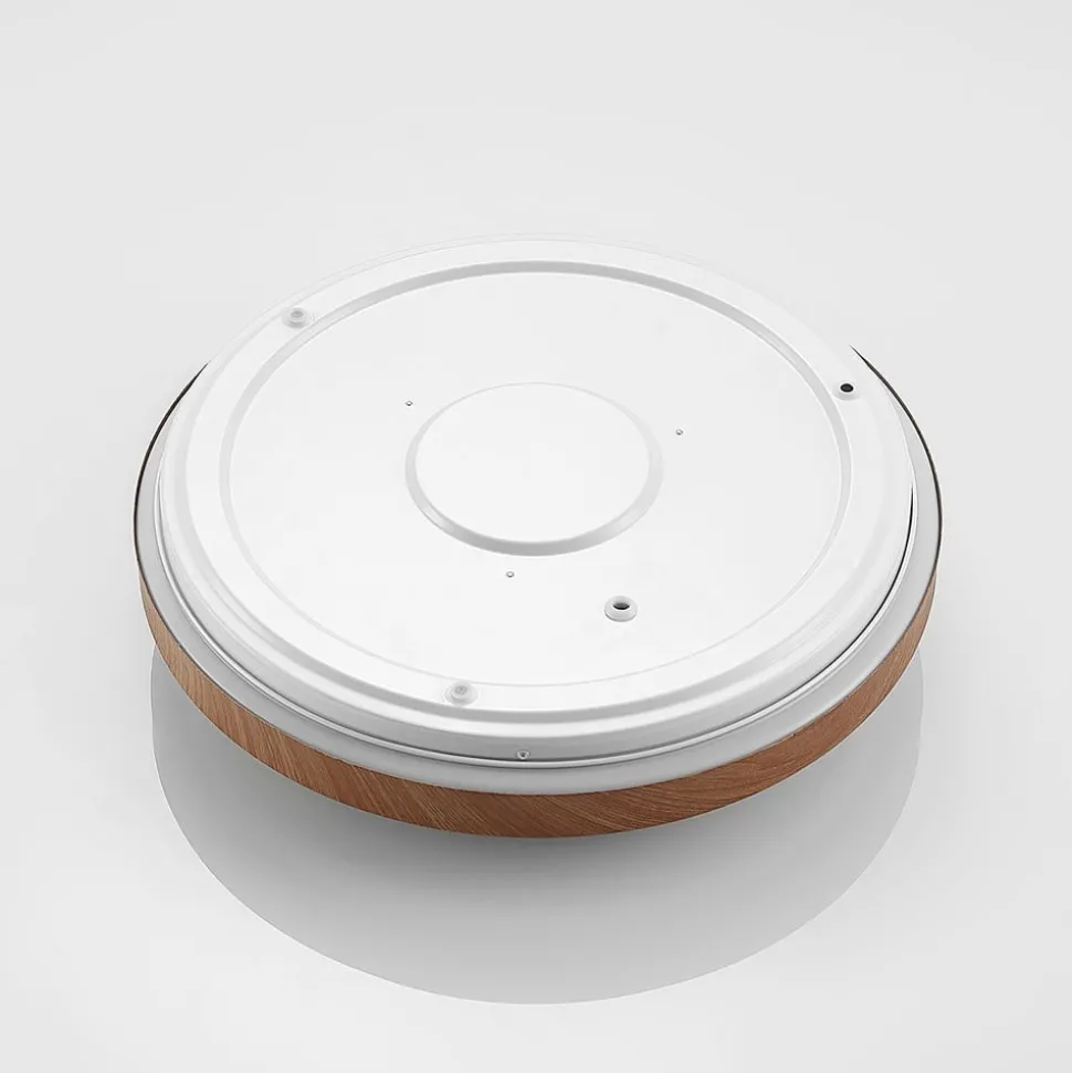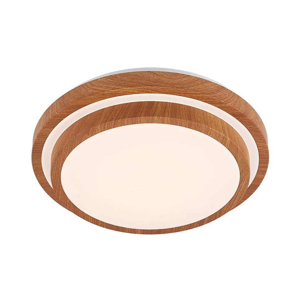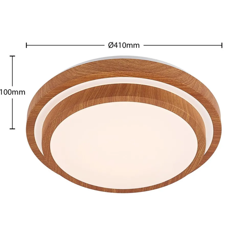Ronde Vaako LED plafondlamp met frame in houtlook De Vaako LED plafondlamp is iets heel speciaals en maakt indruk met zijn opvallende, ronde aluminium frame in een houtlook afwerking. Het bestaat uit twee ronde elementen die op elkaar zijn gemonteerd en een aantrekkelijke vorm creëren dankzij hun verschillende afmetingen. Achter de witte diffuser bevinden zich permanent geïnstalleerde LED’s, die een warmwit licht produceren en zo de juiste sfeer creëren voor woonruimtes. De elegante uitstraling van de Vaako LED plafondlamp past perfect in een woonkamer of studeerkamer en gaat moeiteloos op in de rest van het meubilair. De platte afmetingen passen ook in lage ruimtes en zijn ruimtebesparender dan een plafondlamp met grote afmetingen.