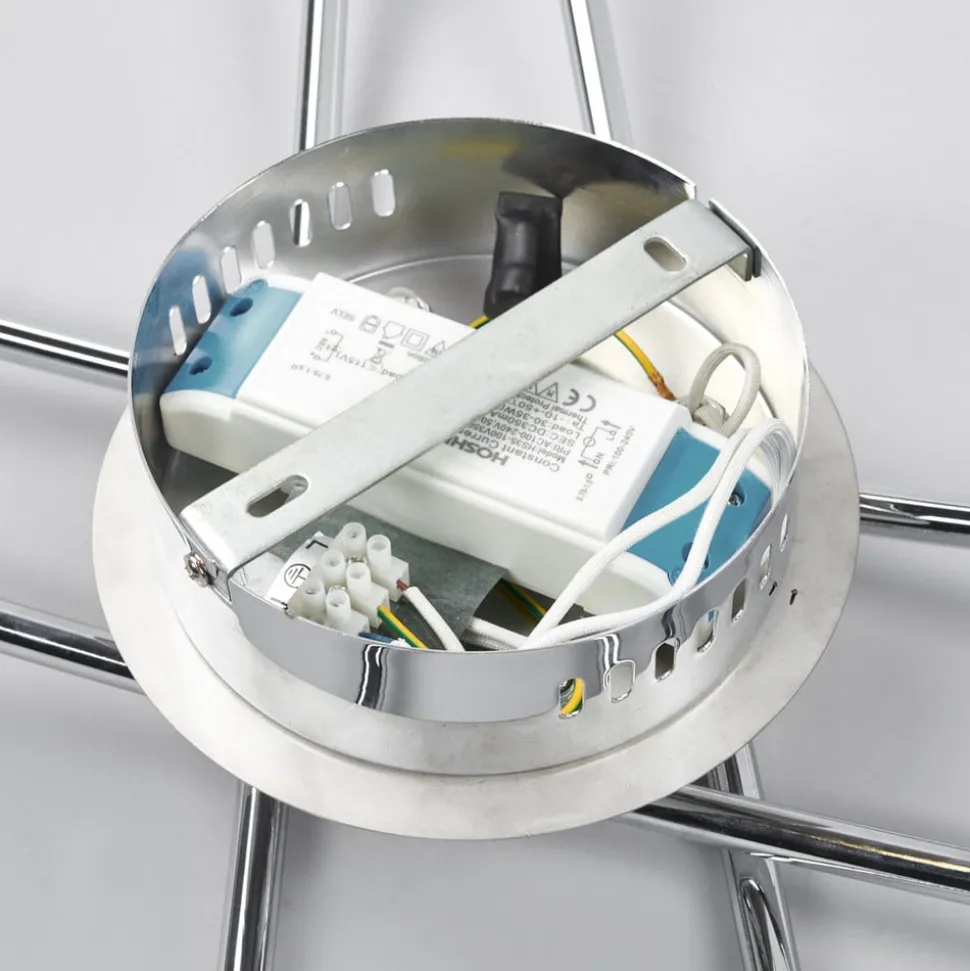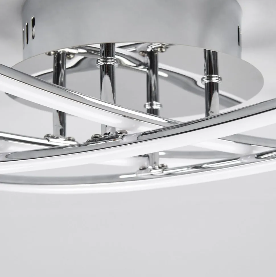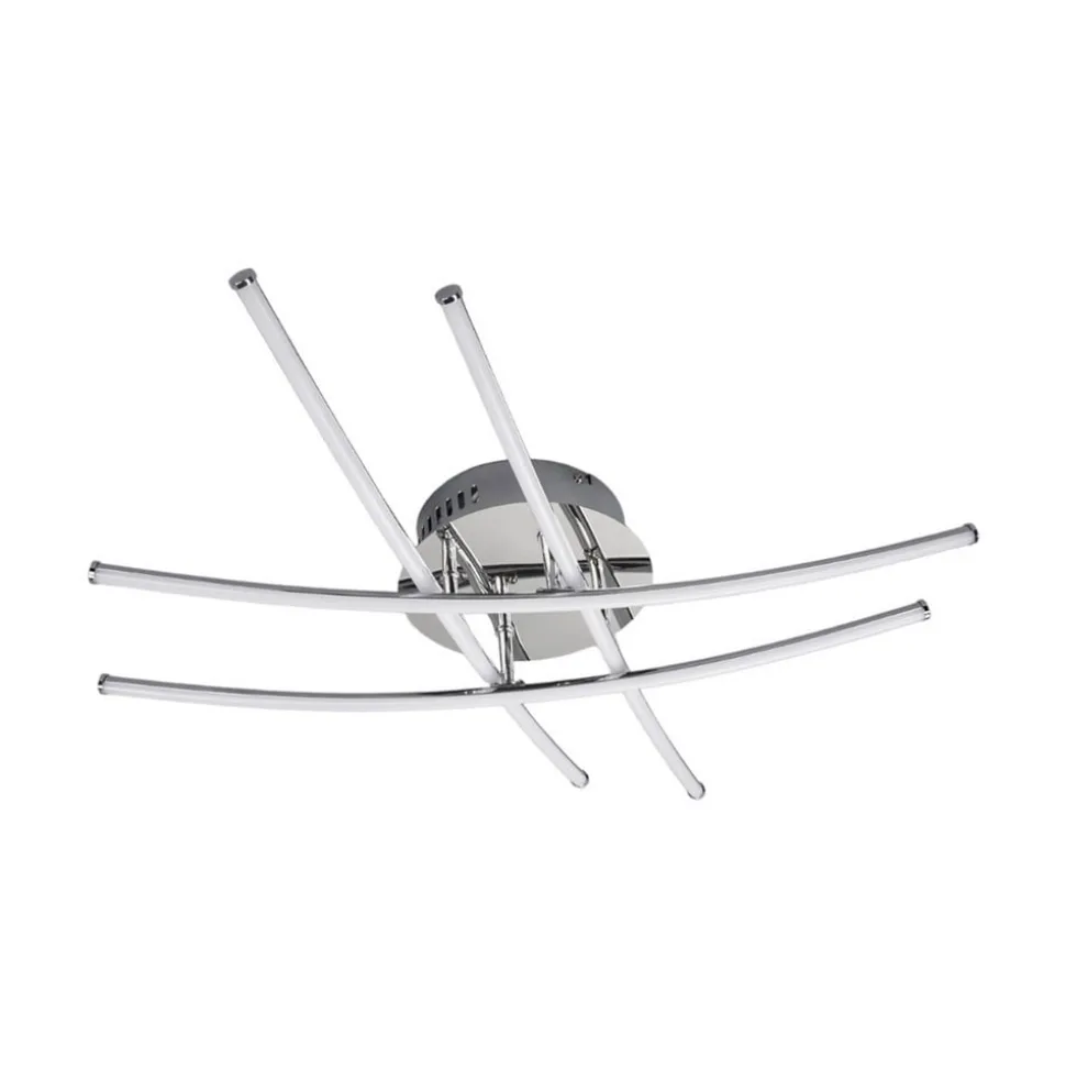 Als een sierlijk raster aan het plafond: de fijn afgewerkte LED plafondlamp Yael Deze plafondlamp is niet versierd met conventionele kappen, maar met vier smalle staven die elkaar kruisen en zo de indruk van een raster geven. Dit wordt mogelijk gemaakt door de geïntegreerde LED-technologie, omdat LED’s meestal zo klein zijn dat ze op bijzonder individuele manieren kunnen worden gerangschikt, waardoor het uiterlijk van plafondlampen niet langer gebonden is aan het klassieke uiterlijk van een frame met kap(pen). Met haar uitzonderlijk goede helderheid is de LED plafondlamp ideaal voor de basisverlichting van een ruimte, die vervolgens kan worden aangevuld met andere lichtbronnen.