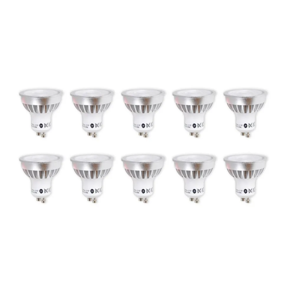 GU10 5 W LED reflectorlamp in een praktische set van 10 Deze reflectorlamp maakt indruk met een geweldig en tijdloos ontwerp en is zeer energiebesparend dankzij de nieuwste LED-technologie. Deze reflectorlamp is een betrouwbare en duurzame lichtbron en straalt tot 20.000 uur warmwit licht uit van 3.000 Kelvin. Met een laag wattage van 5 watt kan deze LED lamp conventionele halogeenreflectoren tot 45 watt vervangen. Dankzij het ontwerp en een stralingshoek van 55° is de reflector zowel geschikt voor huishoudelijk gebruik als voor het verlichten van winkelruimtes, vitrines, musea of voor accentverlichting in de horeca. Eigenschappen: – heeft een vermogensfactor van 0,5 – kan niet worden gedimd – straalt een warmwit licht uit gedurende ongeveer 20.000 uur – bevat geen kwik – de reflector heeft geen opwarmfase nodig (1 seconde tot 100% helderheid) – behoud van de lichtstroom van de lamp ≥85% bij 75% van de gemiddelde levensduur – geleverd in een praktische set van 10