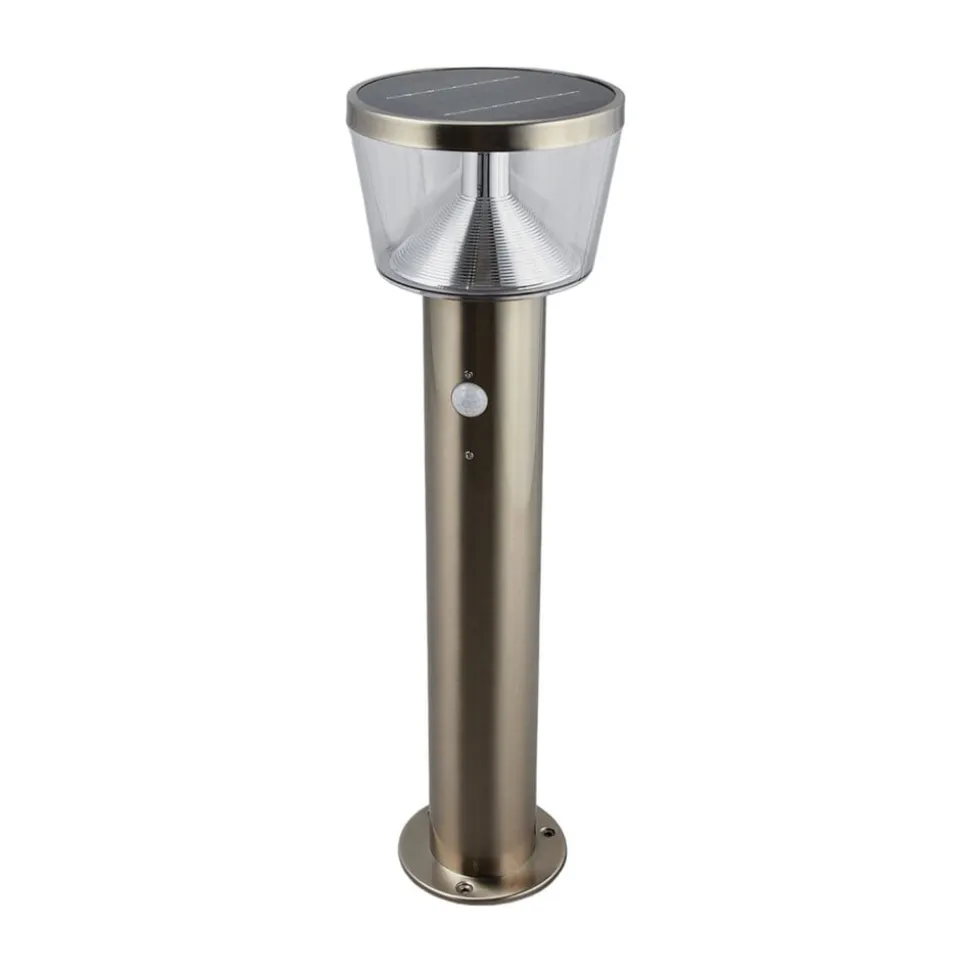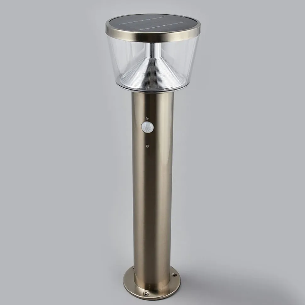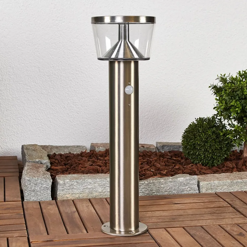 Antje LED sokkellamp van roestvrij staal met bewegingsmelder Antje doet het ook buiten goed en heeft een verhoogde functionaliteit dankzij de bewegingsmelder en de zonnetechnologie. Het zonnepaneel bovenop de lampenkop vangt de zonnestralen overdag op en zet hun energie om in elektriciteit, die vervolgens ’s avonds beschikbaar is voor de LED-verlichting. Dit betekent dat er geen stroomaansluiting nodig is voor de buitenverlichting en dat je relatief onafhankelijk bent bij het installeren van de LED sokkellamp. De aanwezigheidsmelder zorgt ervoor dat de lichtsterkte wordt verhoogd tot vol vermogen wanneer iemand langs de lamp loopt en het licht nodig heeft. Anders heeft de lamp ’s nachts een basislichtsterkte van 75 lumen voor een aangenaam oriëntatielicht. De lichtduur bij volle lichtsterkte is ongeveer 25 seconden, de detectiehoek is 90 graden en het bereik is 2 tot 6 meter. De LED sokkellamp heeft een moderne uitstraling met zijn roestvrijstalen ontwerp. Het licht van de LED’s wordt naar beneden gericht, waar het op het reflecterende oppervlak van een reflectorlamp valt en versterkt wordt in zijn effect.