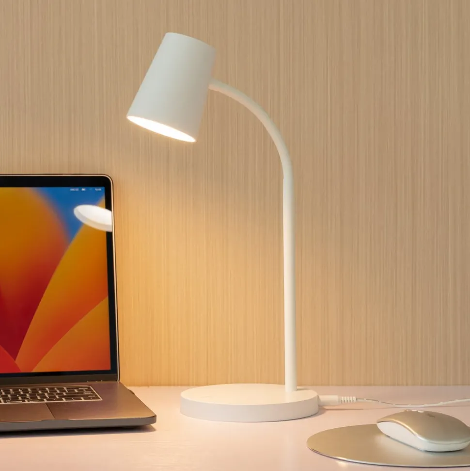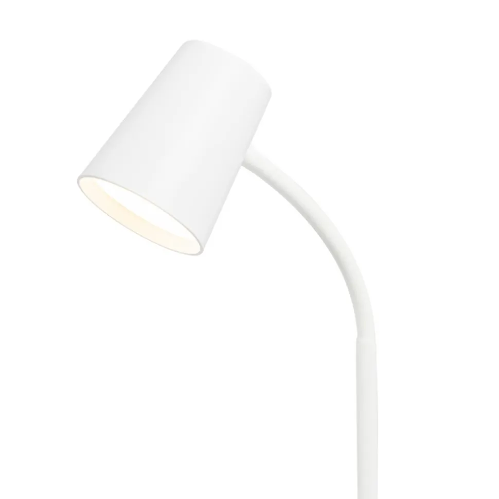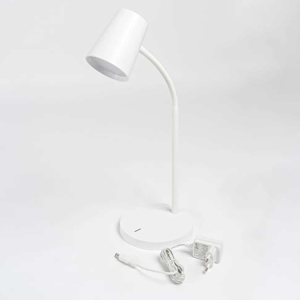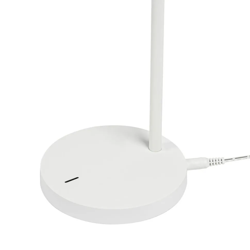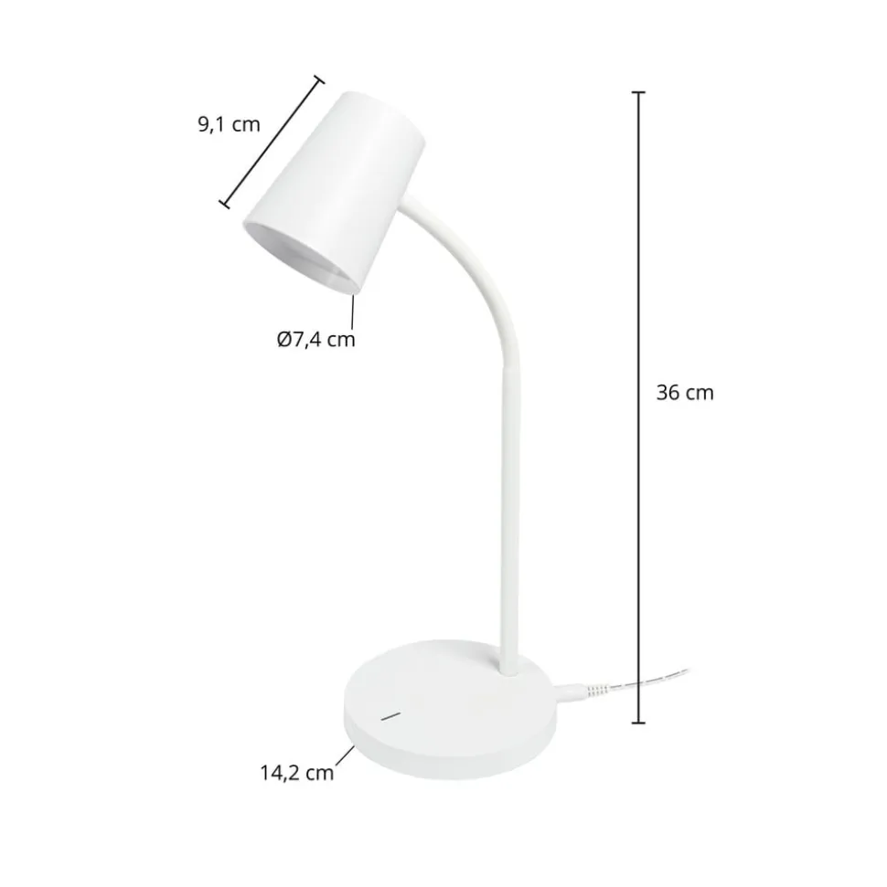 Tijdloos mooie LED tafellamp Ailina met touchdimmer en wit oppervlak Ailina is een elegante LED tafellamp met een flexibele arm aan de bovenkant zodat het licht naar wens kan worden aangepast en individueel kan worden uitgelijnd. Het lichaam van de bureaulamp is volledig wit en de voet is rond, net als de cilindrische kap. De helderheid van het licht kan in drie stappen worden aangepast met behulp van een geïntegreerde touchdimmer en schakelaar en de lamp slaat een goed figuur op het bureau en in andere ruimtes in huis.