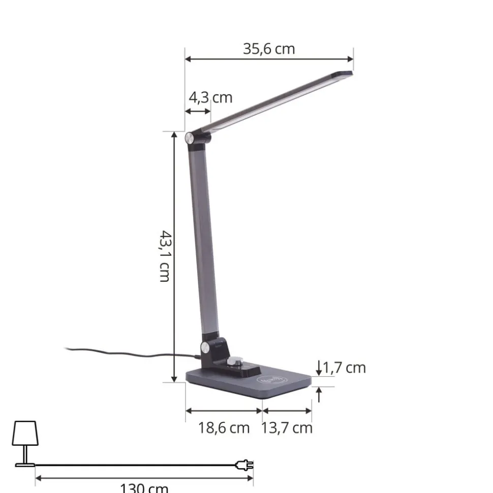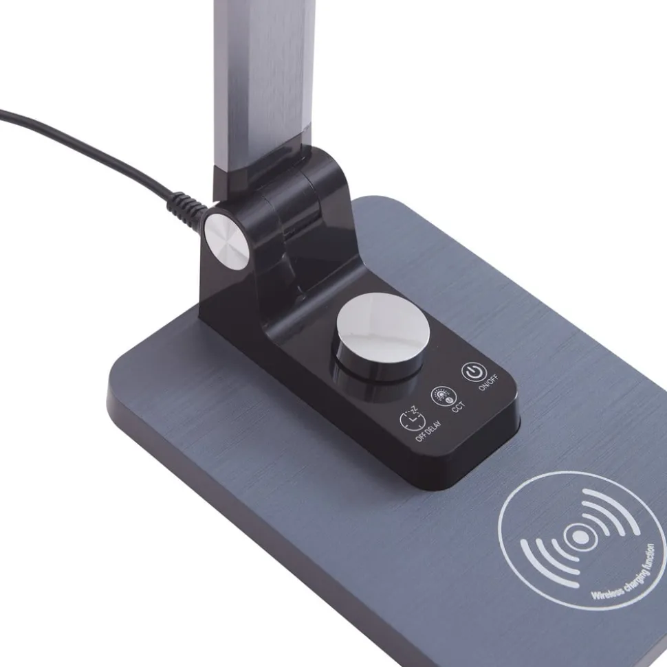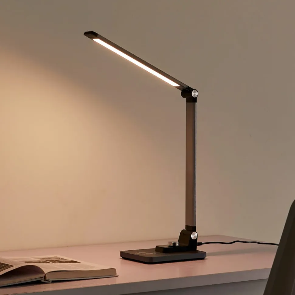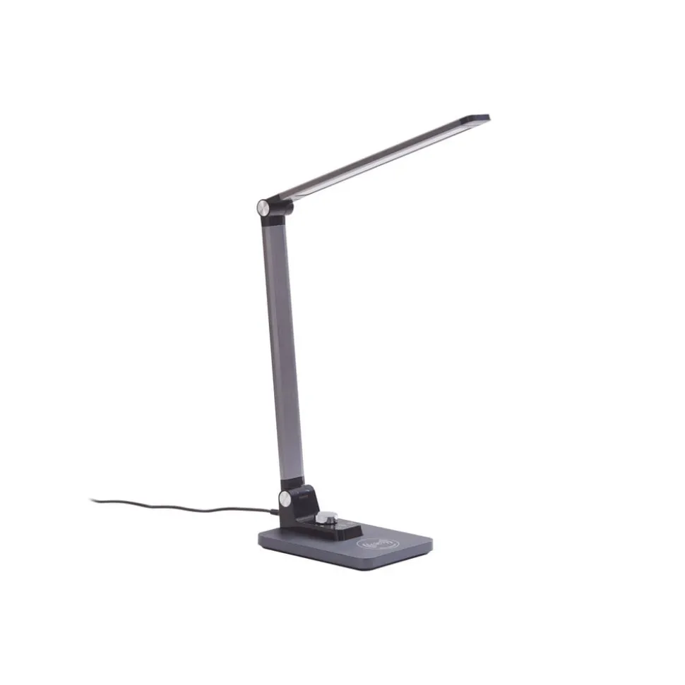 Valtaris LED tafellamp met CCT en dimfunctie in metallic kleur De Valtaris LED tafellamp is ideaal voor op kantoor of in de studeerkamer. Het armatuur heeft een metallic kleur en een modern design. De lamp kan ook traploos worden gedimd en de lichtkleuren kunnen naar wens worden aangepast (3.000 K, 4.000 K en 6.500 K). Een zeer praktisch element is het ingebouwde draadloze oplaadstation, waarmee een mobiele telefoon of andere apparaten kunnen worden opgeladen. Valtaris combineert dus een modern, eenvoudig ontwerp met praktische functies.