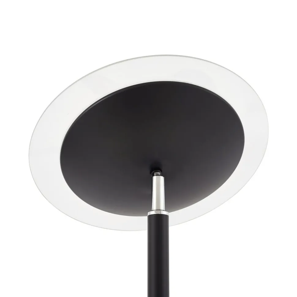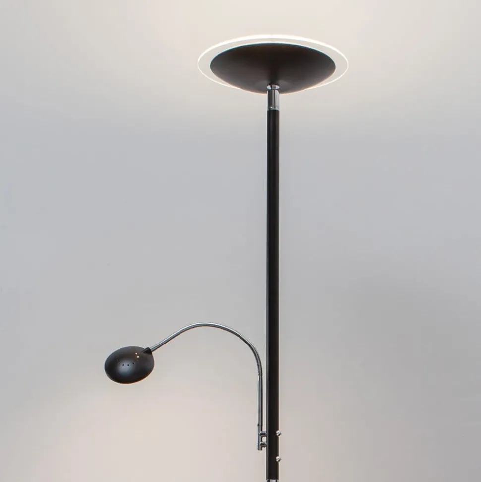 Dimbare Malea LED uplighter met geïntegreerde leeslamp De Malea LED uplighter bewijst een zeer functionele lichtbron te zijn voor de woonkamer, omdat hij is uitgerust met een aantal praktische functies die het comfort verhogen. Hiertoe behoort de leeslamp, die naast de uplighter als tweede lichtbron dient en kan worden gebruikt wanneer je direct licht nodig hebt in plaats van de diffuse, indirecte schijnwerper, bijvoorbeeld omdat je iets wilt lezen of licht werk moet doen. De arm die naar de leeslamp leidt is overal flexibel zodat het licht precies kan worden gericht. Er is ook een dimmer beschikbaar voor beide lichtbronnen, zodat de lichtsterkte kan worden aangepast aan persoonlijke behoeften. Om een van de twee lampen te dimmen, wordt de schakelaar op het frame ingedrukt gehouden en wordt de lichtsterkte omhoog of omlaag bijgesteld tot het gewenste niveau is bereikt. De schijnwerper is bedekt met een gesatineerde glasplaat.
