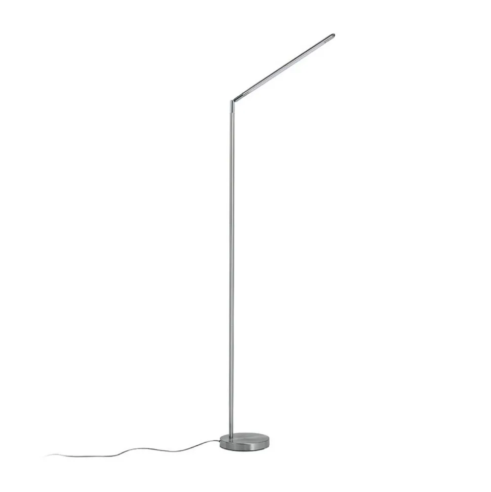 Smalle LED vloerlamp Jabbo met ronde voet en matnikkel afwerking Jabbo lijkt het toppunt van een minimalistische ontwerpstijl en daarom past de LED vloerlamp perfect bij een moderne woonstijl die het motto volgt dat minder meer is. De smalle staaf, die dienst doet als de lampkop, is met een scharnier bevestigd aan de rest van het frame en kan daarom omhoog en omlaag worden bewogen. De schakelkop bevindt zich ook op deze hoogte, namelijk aan het uiteinde van de lampenkop – op het eerste gezicht nauwelijks als zodanig herkenbaar. Jabbo kan met een simpele druk worden in- of uitgeschakeld en het wordt al snel duidelijk dat de focus hier minder ligt op gezellige accentverlichting en meer op het creëren van functioneel, gericht licht dat de ogen ontlast bij het lezen en ook nuttig is voor andere taken in huis.
