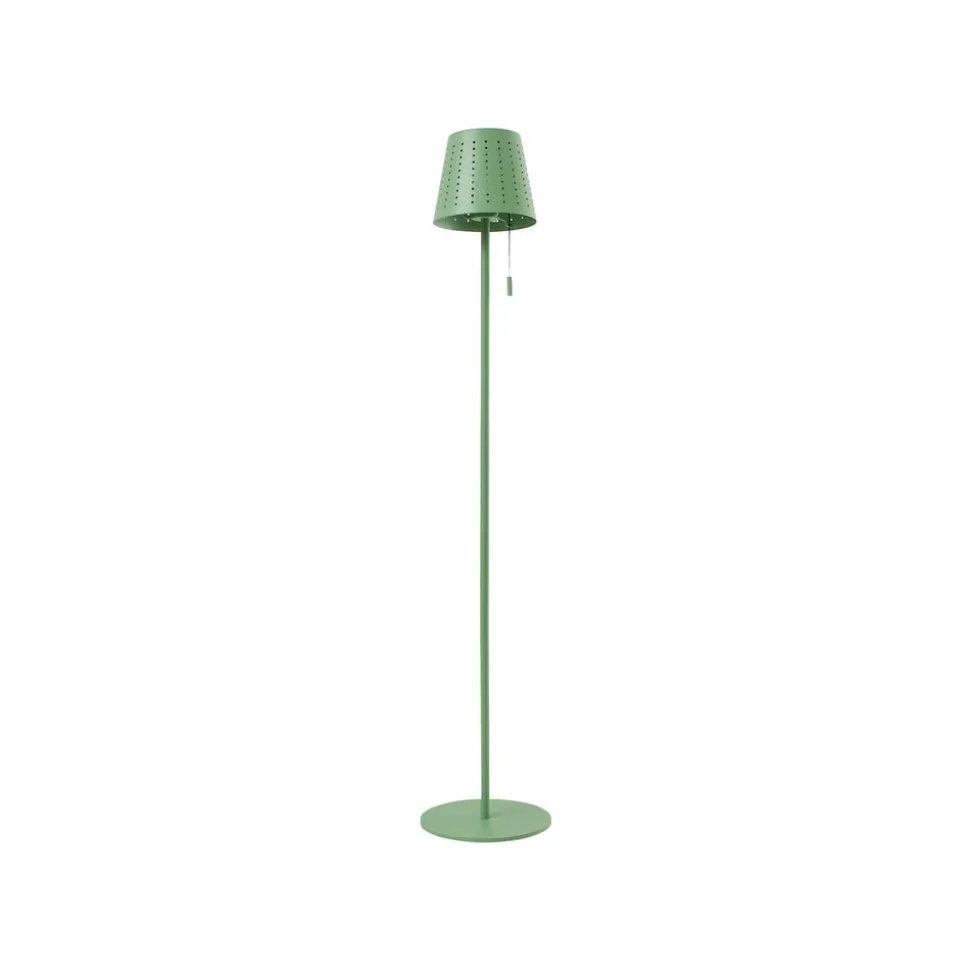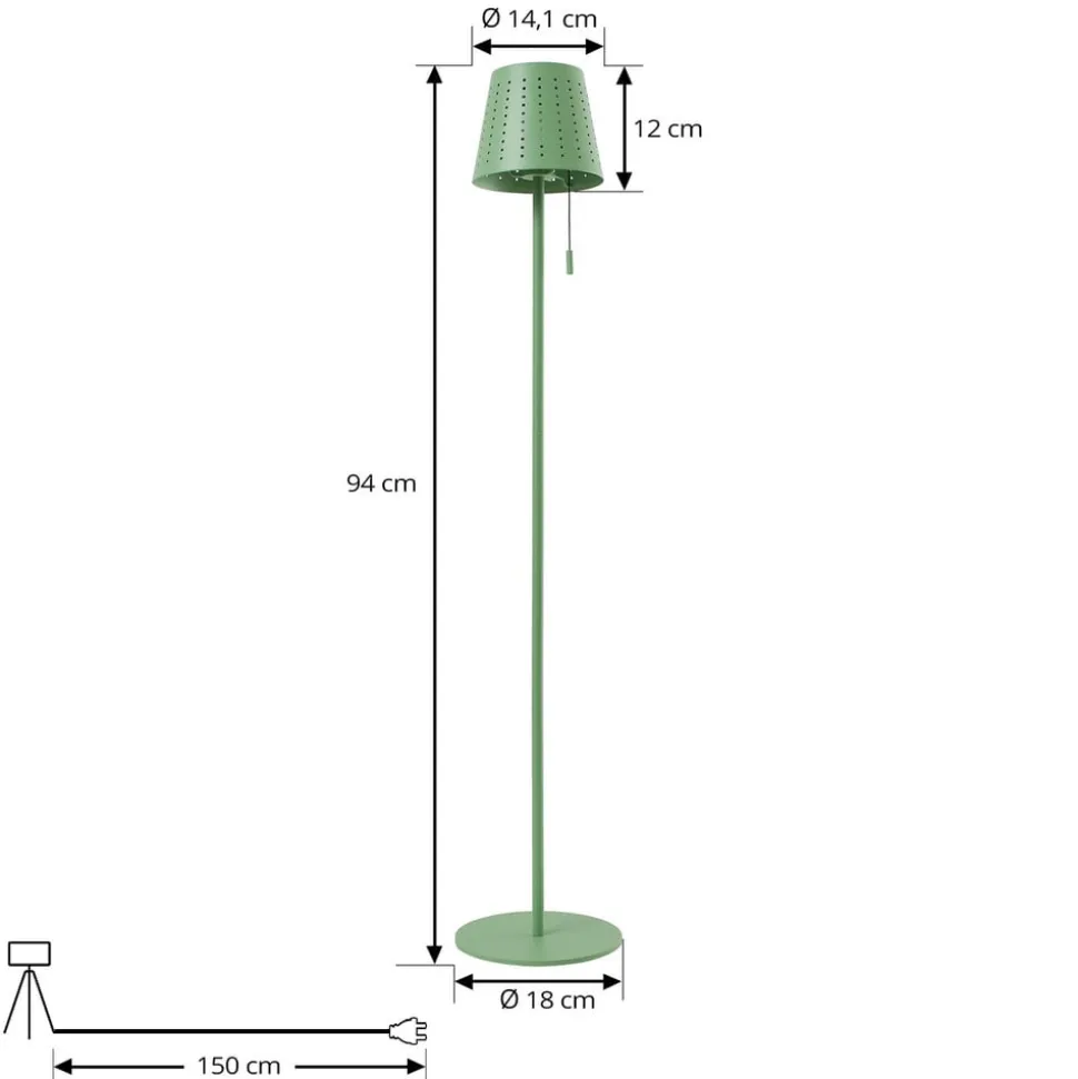 Moderne LED vloerlamp Hilario voor buiten, op zonne-energie De Hilario LED vloerlamp op zonne-energie in saliegroen combineert stijlvolle verlichting met functionele innovatie. Deze vloerlamp is speciaal ontworpen voor buitengebruik om balkons en terrassen om te toveren in een sfeervolle oase. Dankzij de geïntegreerde LED-lichtbron en de batterijtechnologie op zonne-energie biedt Hilario een energiebesparende en vooral flexibele verlichtingsoplossing. Met de geïntegreerde dimfunctie kan de lichtintensiteit naar wens in drie fasen worden aangepast, zodat voor elke situatie de juiste sfeer wordt gecreëerd. De vloerlamp Hilario creëert een uitnodigende sfeer met haar aangename licht dat voornamelijk wordt gegenereerd door de kap in een geperforeerd ontwerp. Het robuuste ontwerp van de armatuur zorgt voor een lange levensduur en de saliegroene kleur past harmonieus in de natuurlijke omgeving. De trekschakelaar maakt moeiteloze bediening mogelijk – monokristallijn siliconen zonnepaneel – incl. 18650 Li-Ion batterij, 3,7 V, 2.200 mA – lichtduur 6u, oplaadtijd 6u