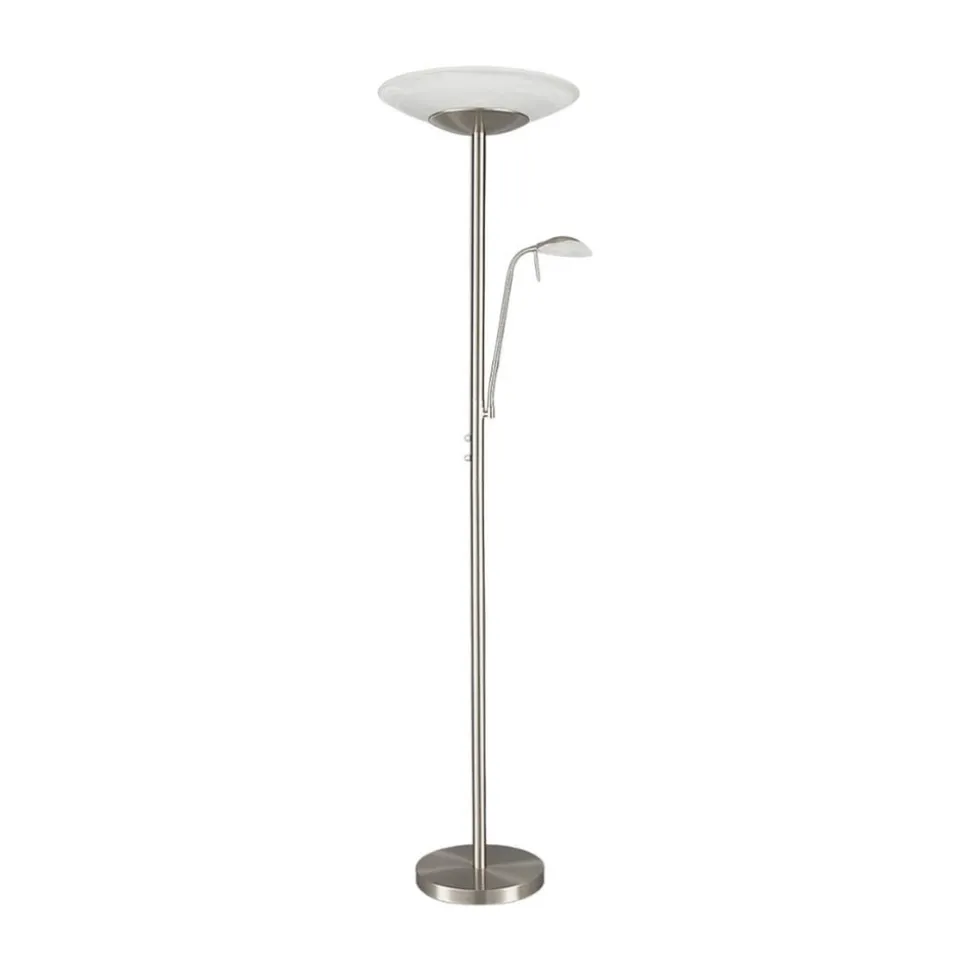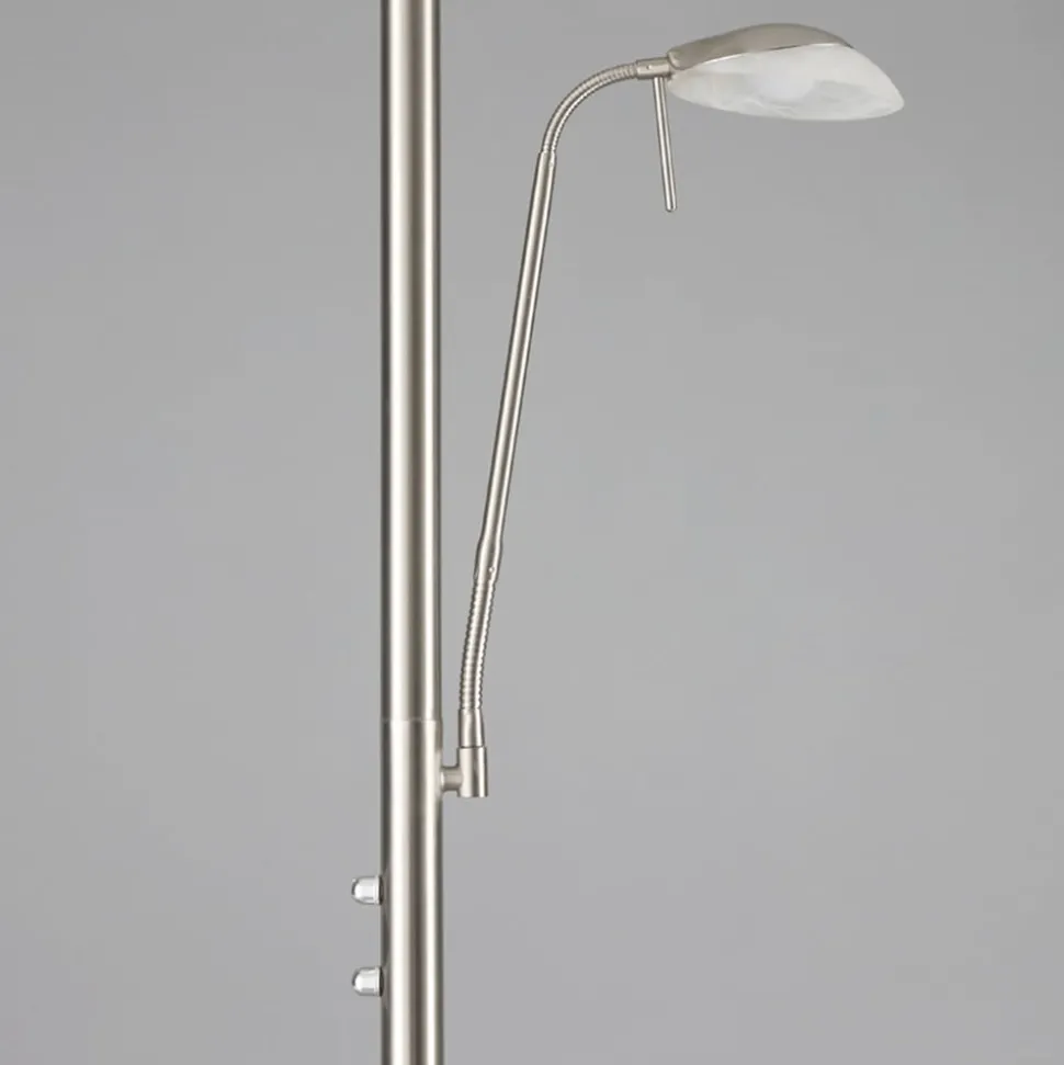 LED vloerlamp Ragna in de vorm van een schijnwerper met albast-look kap, leeslamp en twee draaidimmers De LED vloerlamp Ragna lijkt op een schijnwerper en integreert ook een leeslamp, waardoor de lamp functioneler wordt en niet alleen voorziet in de behoefte aan gezellige, indirecte verlichting. De leeslamp, die net als de schijnwerper werkt met warmwitte LED’s, bevindt zich op middelhoge hoogte op het frame en kan indien nodig beter worden uitgelijnd. De twee lichtbronnen kunnen afzonderlijk voor elke lamp worden gedimd, aangezien er twee draaidimmers op het frame zitten voor een traploze aanpassing van de helderheid. De kap in de vorm van een kom die aan de bovenkant open is, heeft een aantrekkelijke albasten look, waardoor het lijkt alsof er zachte mist door het glas beweegt. De LED vloerlamp met leeslamp is vooral in de woonruimte een uitstekende aanvulling, omdat hij gezellig, behaaglijk licht combineert met het gerichte licht dat je nodig hebt om te lezen, zodat je ogen niet voortijdig vermoeid en geïrriteerd raken.