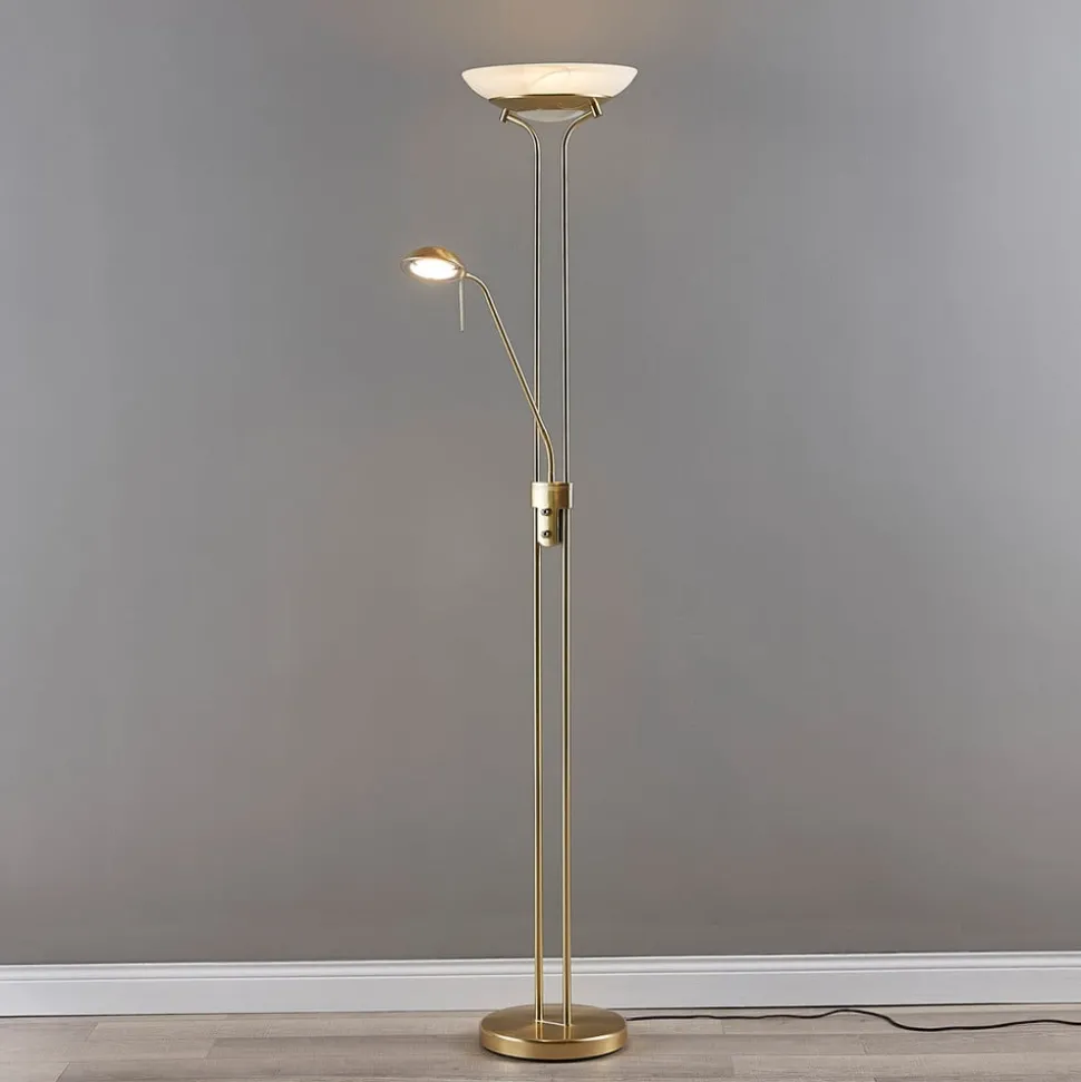 Messingkleurige LED uplighter Yveta met praktisch leeslampje en twee dimmers Wie een messingkleurige lamp kiest voor zijn woonruimte, volgt meestal een wat klassiekere stijl als het gaat om inrichting. De Yveta LED uplighter kan daarom ook prachtig gebruikt worden om een klassieke sfeer te verlichten, omdat het metalen frame volledig messingkleurig is afgewerkt. De vloedvormige kap van de uplighter is gemaakt van wit glas met een zachte albasten tint en creëert na inschakeling een warm, uitnodigend licht met een indirect karakter. De LED uplighter lijkt daarom een zeer nuttige lichtbron, vooral voor die gezellige uurtjes waarin je achterover leunt en ontspant. Natuurlijk breng je veel gezellige avonden door op de bank in zacht licht, maar soms zit of lig je er ook om te lezen of een andere activiteit uit te voeren die niet alleen volledige concentratie vereist, maar ook voldoende helder licht. Dan kun je profiteren van het geïntegreerde LED leeslampje dat uit de arm van Yveta steekt en meer in de kamer projecteert. De leesarm heeft twee gewrichten die oneindige beweging mogelijk maken, zodat je precies de plek kunt bereiken waar je het heldere, gecentreerde licht nodig hebt. Het is duidelijk dat Yveta een lichtbron is die al veel functionaliteit heeft. De twee dimmers op het frame van het armatuur bieden nog meer voordelen, omdat de helderheid van de uplighter en de leeslamp gemakkelijk kan worden geregeld – zelfs afzonderlijk! De LED lampen zijn uiteindelijk verantwoordelijk voor het laag houden van het energieverbruik, ook al kan Yveta heel fel schijnen.