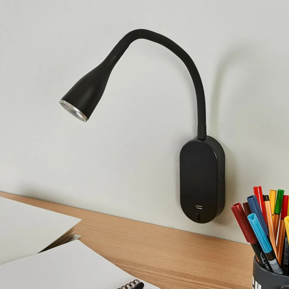 Lindby LED wandlamp Enna, 34 cm, zwart, schakelaar, USB