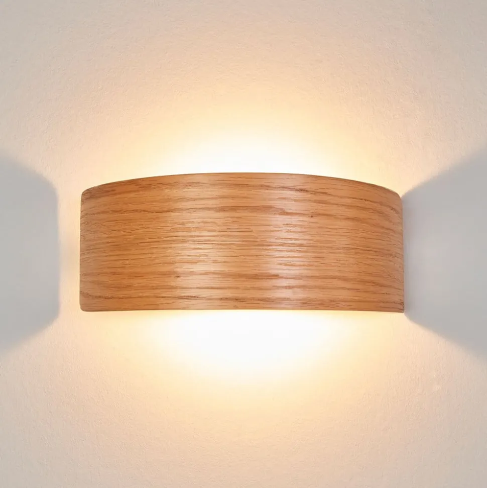 Elegante houten LED wandlamp Rafailia voor sfeervolle woonkamerverlichting Rafailia is bijzonder geschikt voor gebruik in woonkamers in Scandinavische stijl, omdat deze inrichtingsstijl zowel heldere, gedetailleerde vormen als hout als basismateriaal waardeert. Deze LED wandlamp heeft geen stereotiep gevormde kap, maar bestaat uit een licht gebogen houten paneel. Dit creëert een zeer aantrekkelijk lichtpatroon zonder verblinding en met een gezellig effect. De LED wandlamp van hout past ook goed bij de moderne chalet look.