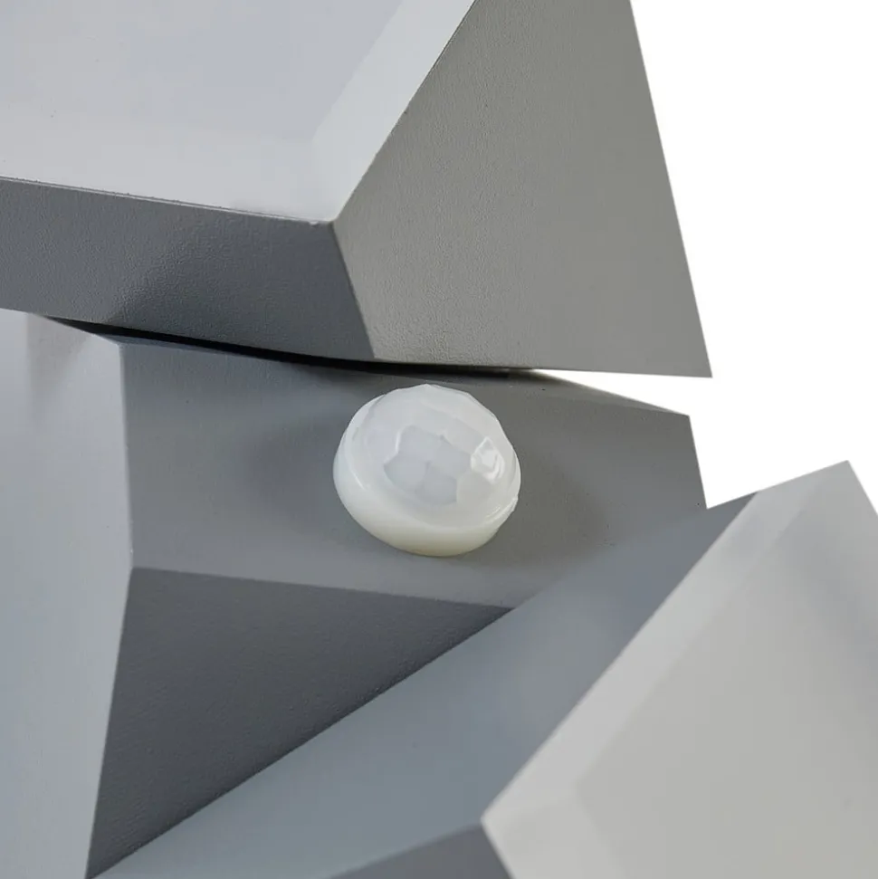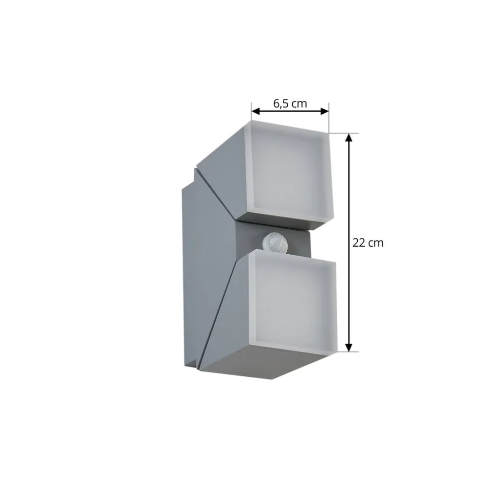 Sally LED buiten wandlamp in grijs design met draaibare lampenkoppen Deze 2-lamps lamp, afgewerkt in elegant grijs, is speciaal ontworpen voor buitengebruik en biedt betrouwbare bescherming tegen stof en spatwater dankzij de beschermingsgraad IP54. Of het nu op het terras of balkon is, Sally plaatst moderne accenten en creëert een sfeer die zowel rustgevend als stimulerend is dankzij de geïntegreerde LED-lichtbron. Het intelligente sensorsysteem zorgt voor energiebesparende verlichting die alleen wordt geactiveerd als het echt nodig is. Met Sally breng je fascinerend licht in je buitenruimte dat niet alleen de stemming verbetert maar ook de productiviteit verhoogt. De lampenkoppen kunnen 180° worden gedraaid, waardoor een flexibele verlichting mogelijk is. Technische kenmerken Sensor – Detectiehoek 105° – Detectiebereik 6-8m – Verlichtingstijd instelbaar van 8 seconden tot 5 minuten – Optimale installatiehoogte 1,8m