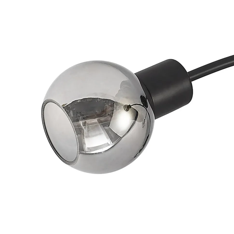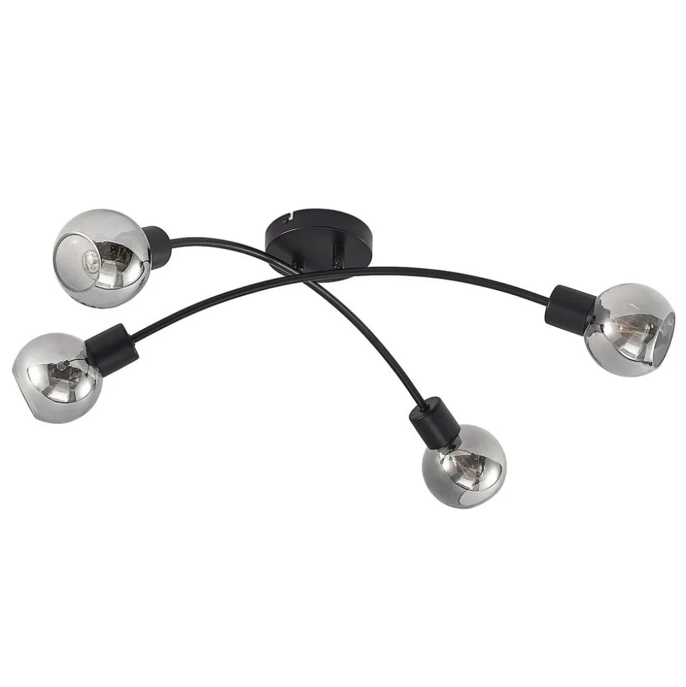 4-lamps plafondlamp Lioma met kap van gerookt glas Lioma is een aantrekkelijke plafondlamp met een donker ontwerp. Het is gemaakt van staal en heeft een zwarte afwerking. Het heeft ook vier kappen van rookglas, wat momenteel erg trendy is. In de E14 fitting passen alle geschikte lampen. De strakke look van deze lamp past zowel in een woonkamer als in een slaapkamer, dus hij kan voor verschillende gelegenheden gebruikt worden – perfect om een beetje extra pit toe te voegen aan een moderne omgeving.
