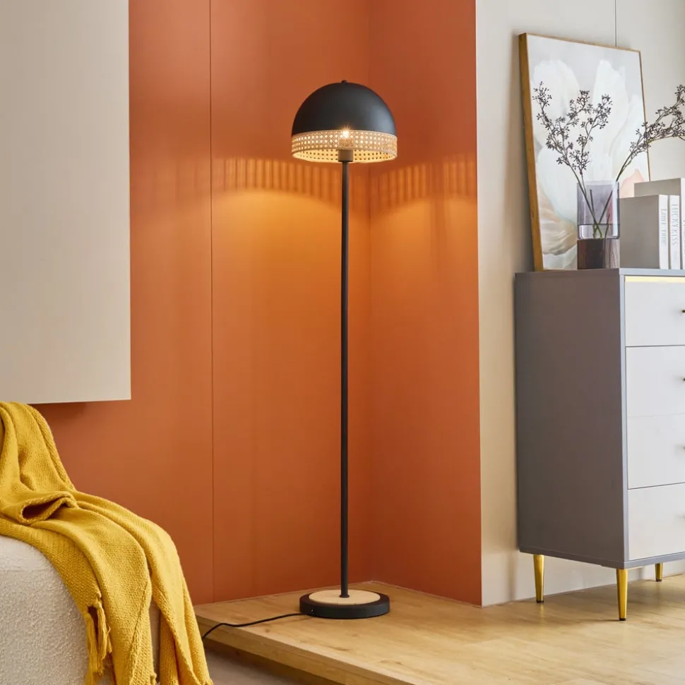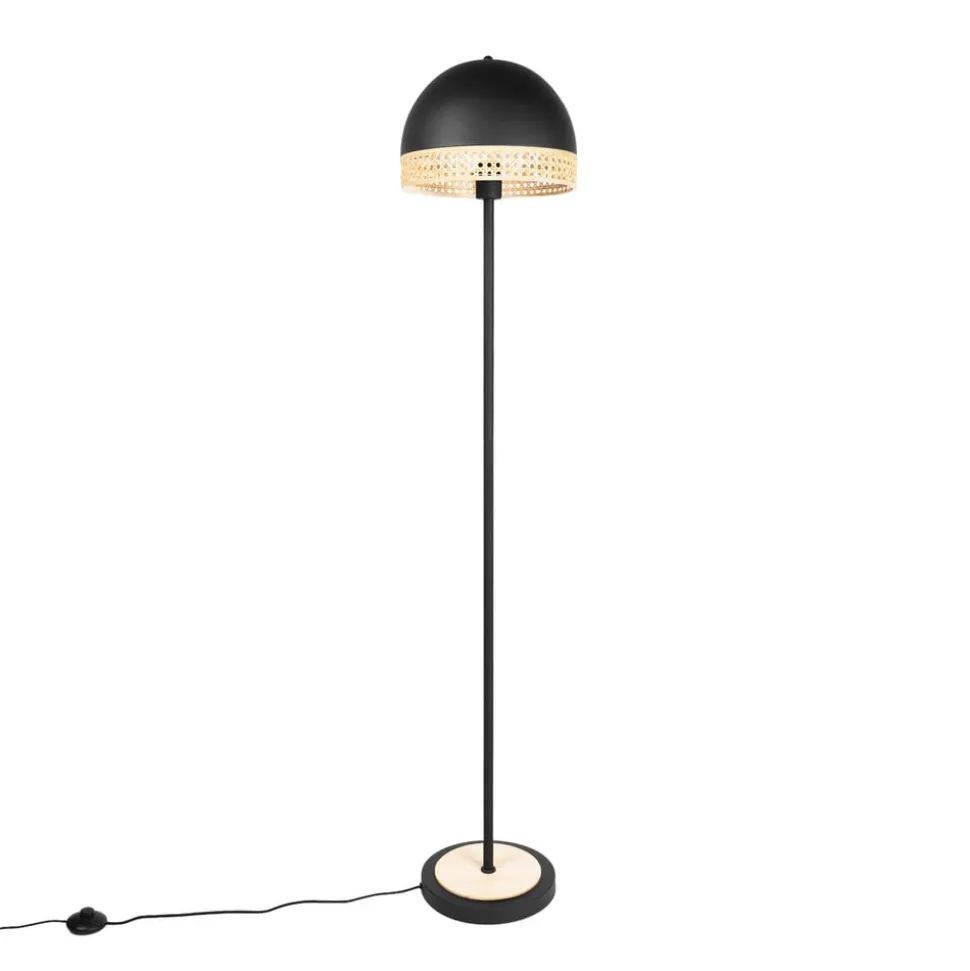 Ronde vloerlamp Lonnaris met zwarte koepelkap en bamboedecor in Weens vlechtwerkDeze vloerlamp is zeer geschikt voor veel woonkamers, maar kan zeker ook in een slaapkamer worden geplaatst, waar zij een zeer behaaglijk licht creëert dat volledig verblindingsvrij is, omdat de zwarte metalen koepel op zich ondoorzichtig is, zodat de lichtschijn alleen naar beneden kan ontsnappen en de lichtbron vanuit de meeste gezichtspunten niet direct te zien is. De onderste rand van de kap is in een bezienswaardig contrast gehouden, omdat hij zowel qua kleur als qua materiaal en structuur afwijkt van het zwarte metaal dat verder de armatuur domineert. Zij bestaat uit een sierlijk bamboedecor, algemeen bekend als Weens vlechtwerk, dat al een goede eeuw geleden bekend was en een bijzonder stijlkenmerk is dat nu weer helemaal in de mode is en sinds geruime tijd weer op verschillende plaatsen het interieur siert.
