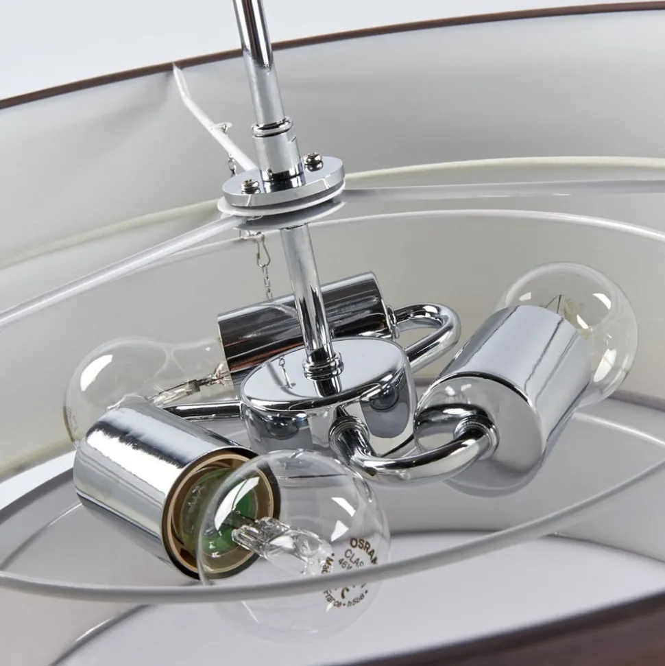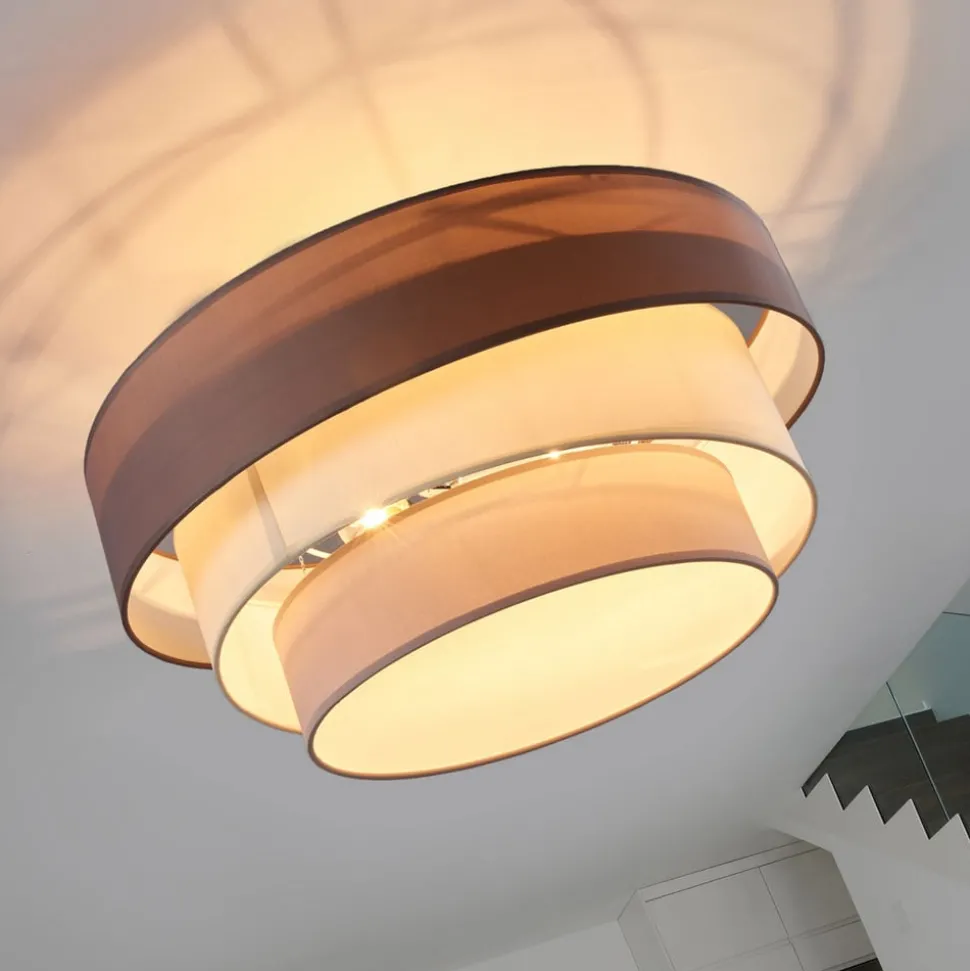Een lichtbron met een harmonieuze uitstraling in bruin, wit en grijs: de stoffen plafondlamp Melia De stoffen kap van plafondlamp Melia is iets heel bijzonders, want hij bestaat uit drie afzonderlijke delen die elkaar gedeeltelijk overlappen en waarbij de diameter afneemt van het buitenste naar het middelste naar het binnenste element. Het gedeeltelijk schuine uiteinde van de afzonderlijke kappen is zeer opvallend en draagt bij aan een speciale uitstraling die wordt gekenmerkt door een grotere individualiteit. Het lichtbeeld wordt door de waarnemer als gezellig en uitnodigend ervaren, de verlichting is voldoende helder, hoewel het gekozen type lichtbron hier natuurlijk ook doorslaggevend is.
