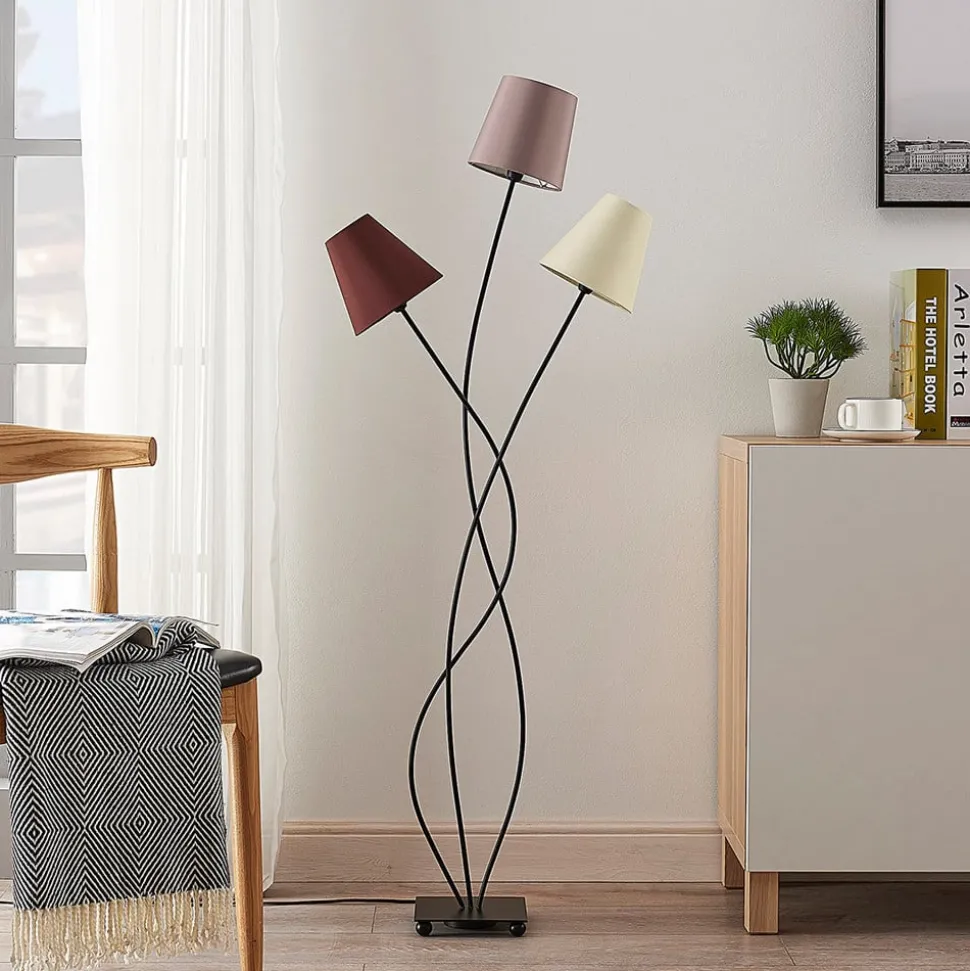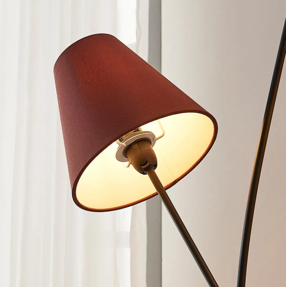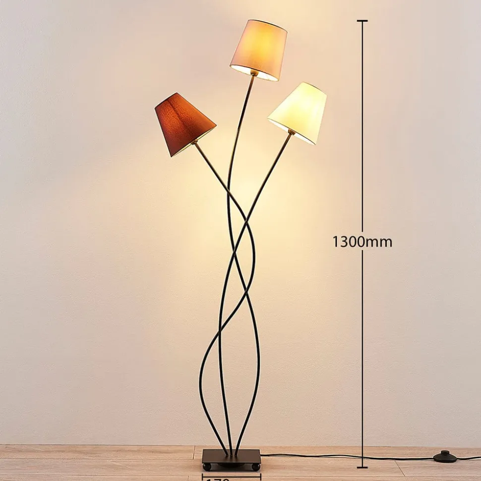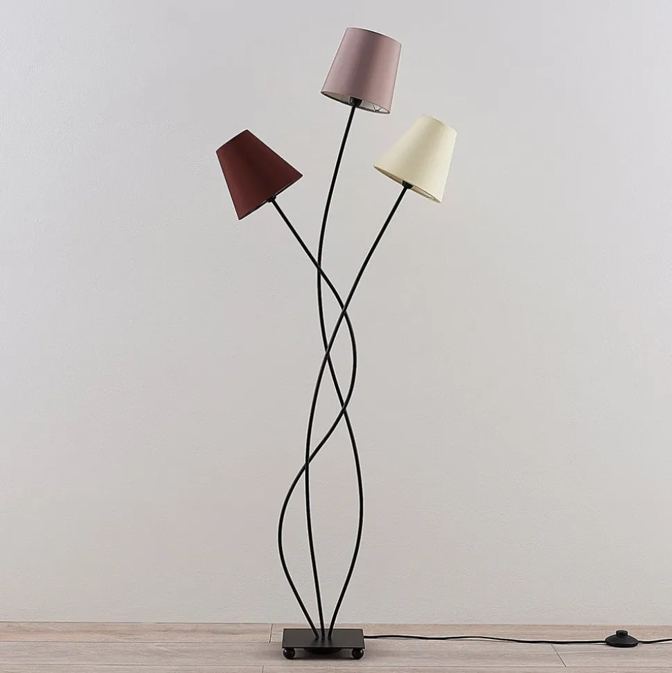 Verstrengelde vloerlamp Melis met kappen in bruin, grijs en crème Melis is een vloerlamp met een zeer speelse uitstraling. Dit komt vooral door de gebogen stangen, die met elkaar verstrengeld zijn en elk naar een kap leiden. De stoffen kappen worden naar boven toe smaller en zijn verkrijgbaar in bruin, grijs en crème. Dit creëert een warme en zachte lichtgloed die een heerlijk knusse sfeer verspreidt. Het frame van de lamp is zwart geschilderd en is even geschikt als accentverlichting voor een woon- of slaapkamer.