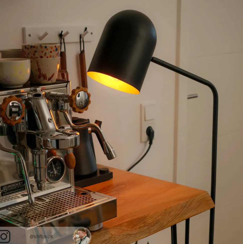 Minimalistisch ogende leeslamp Morik met zwarte en gouden kap Morik past heel goed bij een moderne sfeer of een Scandinavische woonstijl. Van de voet tot de kap is de afwerking van de leeslamp matzwart, alleen de binnenkant van de metalen kap springt er visueel uit omdat deze goudkleurig is getint. Dit resulteert in een warme uitstraling die nog meer opvalt als de lamp aan is. Morik kan worden bediend met de voetschakelaar in het snoer.
