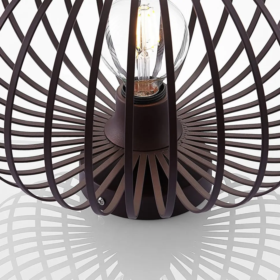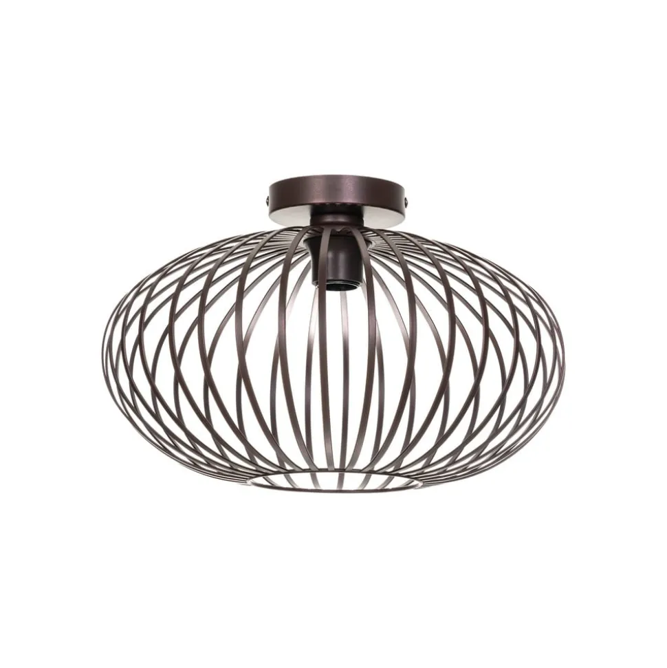 Ronde plafondlamp Nahele met kooikap Rustieke charme omringt de plafondlamp Nahele, die gemaakt is van ijzer. De koffiebruine kleur is bijpassend gekozen en staat er geweldig bij. Kooikappen zijn momenteel erg in de mode en zijn bijzonder aantrekkelijk in huizen die in een vintage stijl zijn ingericht. Een lamp met gloeidraad komt bijzonder goed tot zijn recht in dit armatuur, omdat hij bijna ongehinderd door de open kap kan worden bewonderd en zijn licht laat doorschijnen. De tralies tekenen een bijzonder mooi patroon op het plafond wanneer de lamp aan is.