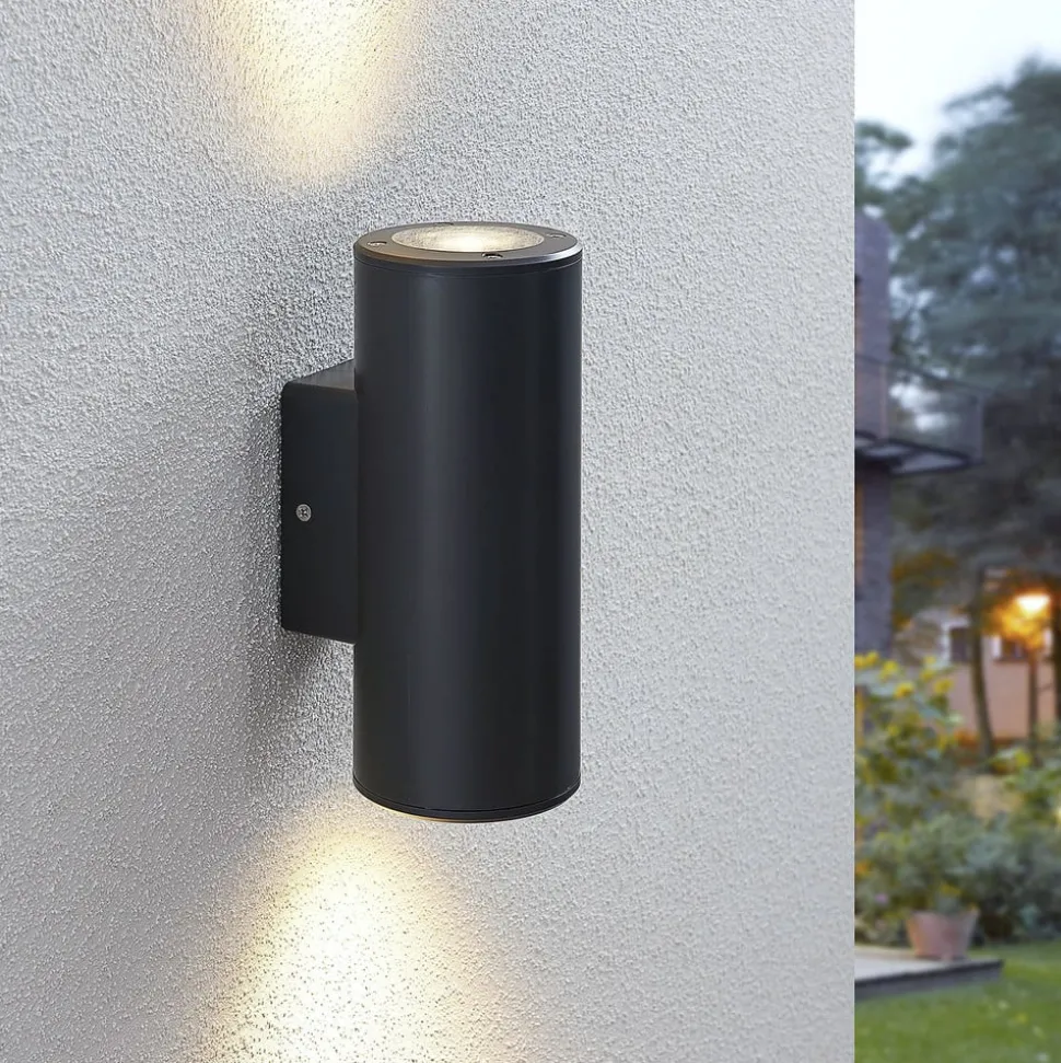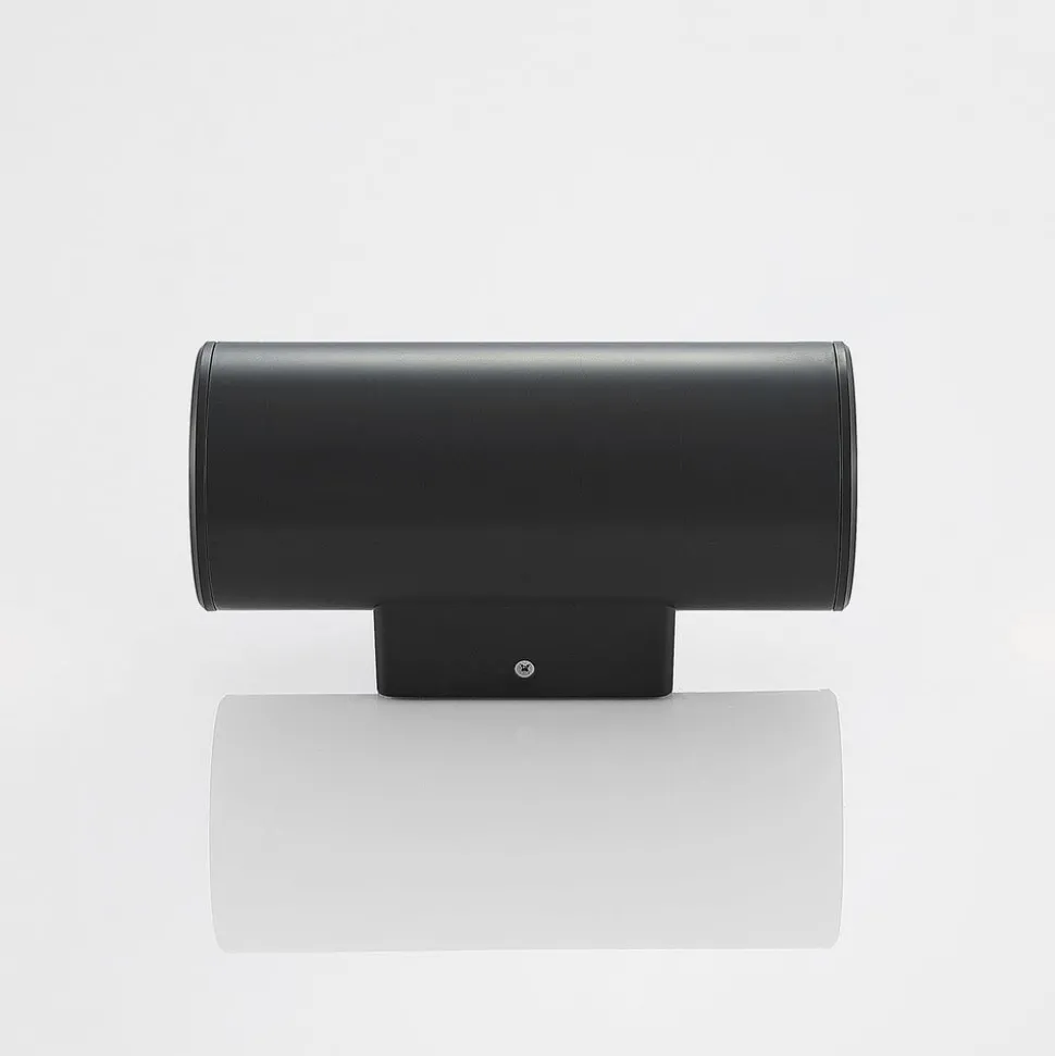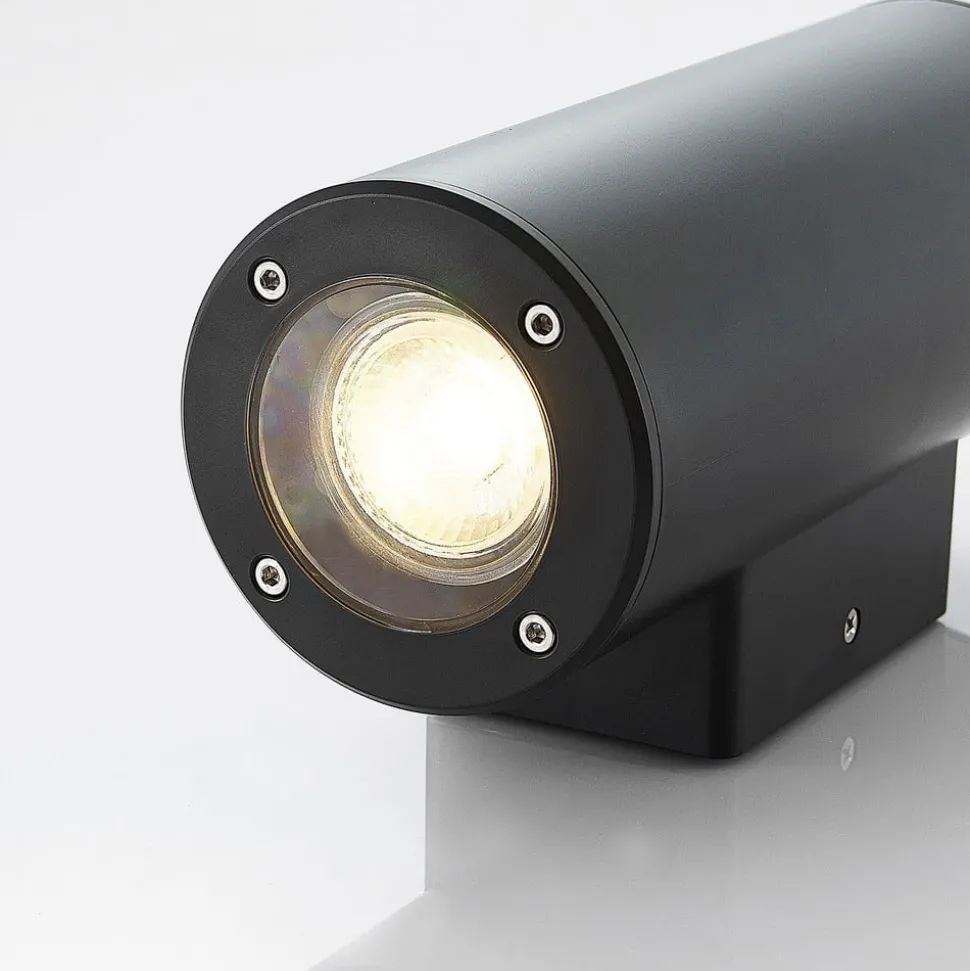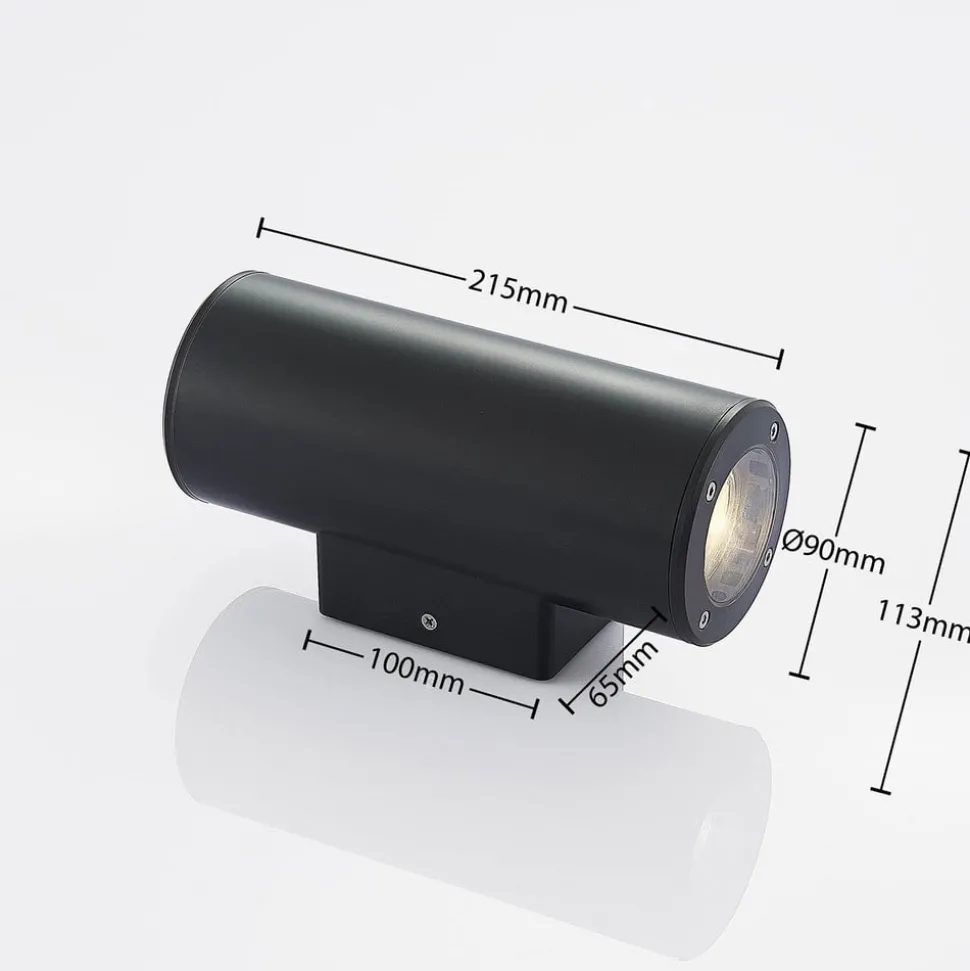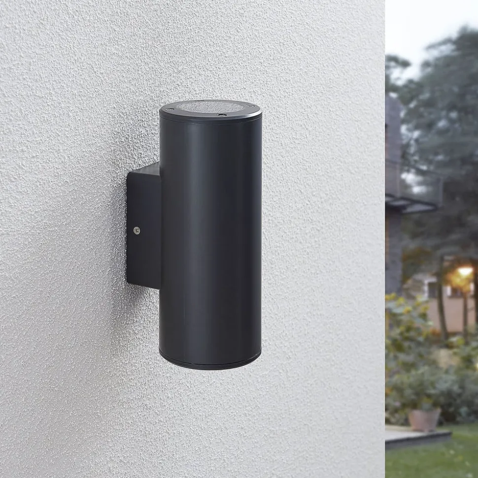 Cilindrische Nati buitenwandlamp met donkergrijze afwerking, zeewaterbestendig, IP54 De Nati buitenwandlamp heeft een cilindrische basisvorm en een kunststof lichtbehuizing. De buitenlamp wordt ook gekenmerkt door haar hoge slagvastheid (IK06) en zeewaterbestendigheid, wat betekent dat ze ook in de buurt van de zee kan worden geïnstalleerd. Dit alles spreekt in het voordeel van een lichtbron die zorgt voor langdurig plezier in buitenruimtes. Het licht wordt direct en indirect uitgestraald, naar beneden en naar boven. Er worden LED lampen met GU10 lampvoeten gebruikt. Samen met de cilindrische armatuur ziet het donkergrijze oppervlak er discreet en tijdloos uit.