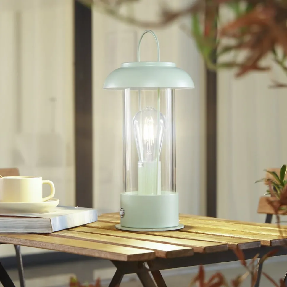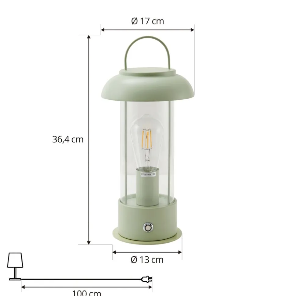 Lindette oplaadbare tafellamp voor buiten met lichtsterkteregeling De Lindby oplaadbare tafellamp combineert functionaliteit met een aantrekkelijk ontwerp en biedt een aanraakgestuurde lichtsterkteregeling voor aangepaste lichtomstandigheden. Met haar groene kleur en beschermingsgraad IP44 is ze geschikt voor zowel binnen- als buitengebruik, ideaal voor patio’s en balkons. De stilistische oriëntatie van het armatuur is zowel geschikt voor moderne als horeca-omgevingen, waardoor ze veelzijdig is. De energie-efficiëntie van de armatuur helpt het elektriciteitsverbruik te verminderen en biedt een duurzame verlichtingsoplossing. Dankzij de geïntegreerde oplaadbare batterij kan het 5 uur lang zonder kabel werken en kan het dus flexibel worden geplaatst. De lantaarn zorgt voor een vleugje retro look – uitgerust met speciale LED E27 lamp – incl. 3600mAh batterij, verlichtingstijd 5u, oplaadtijd 2u – 1m USB-C kabel inbegrepen