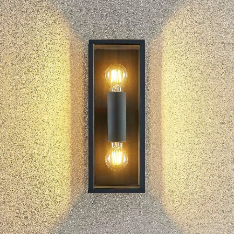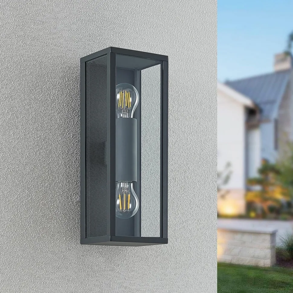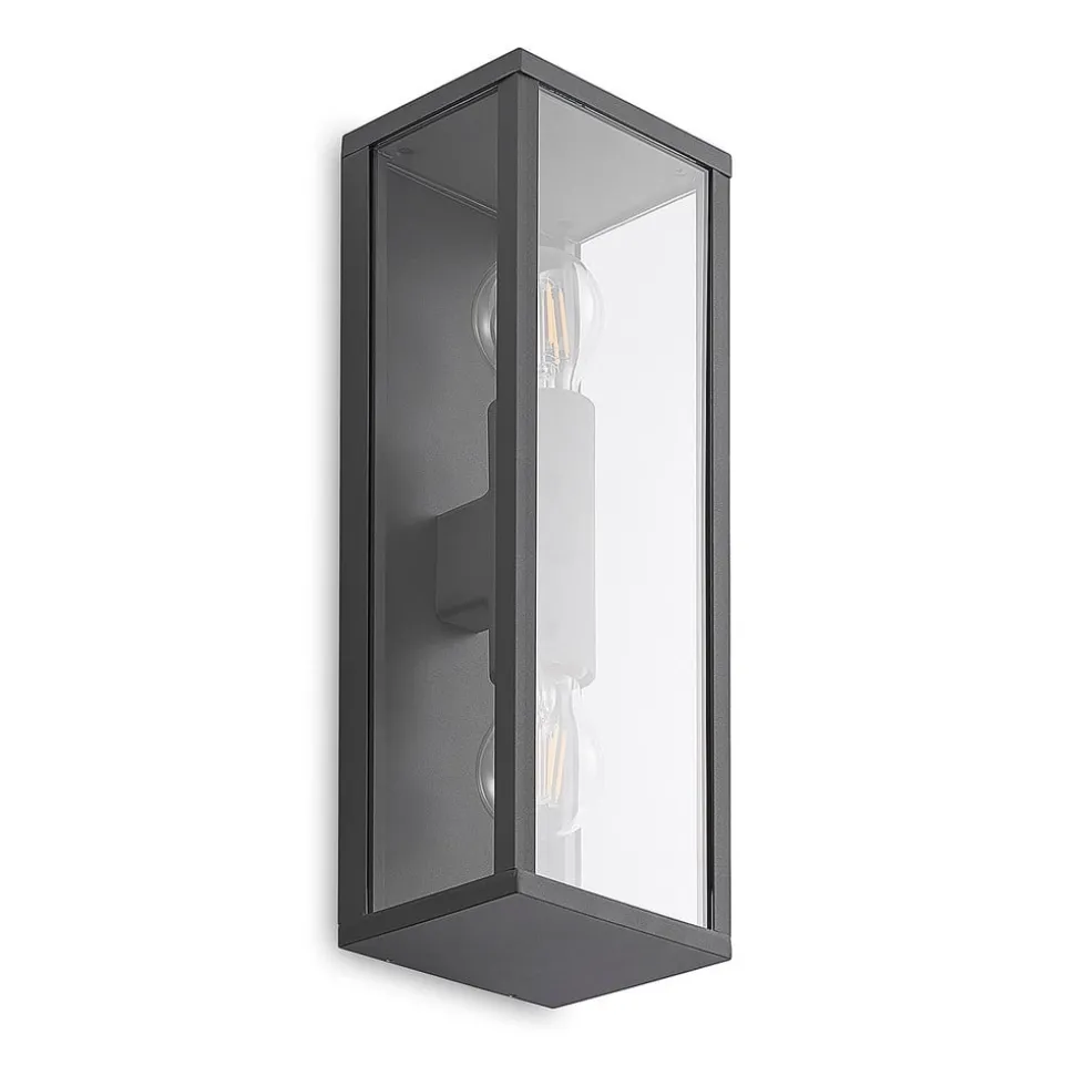 Donkere Peldar buitenwandlamp met twee E27 fittingen De Peldar buitenwandlamp maakt indruk met haar speciale ontwerp. De behuizing is gemaakt van aluminium en heeft een donkergrijze afwerking, waardoor ze afsteekt tegen haar omgeving. De kap is gemaakt van glas, zodat de twee lichtbronnen van alle kanten goed zichtbaar zijn. De fittingen zijn naar boven en naar beneden gericht, wat het armatuur een interessant karakter geeft. De gebruiker kan de te gebruiken lampen naar wens kiezen, maar decoratieve lampen worden aanbevolen om het uiterlijk van het armatuur te benadrukken.
