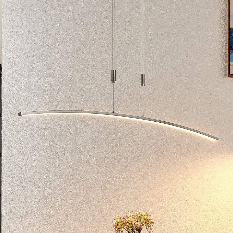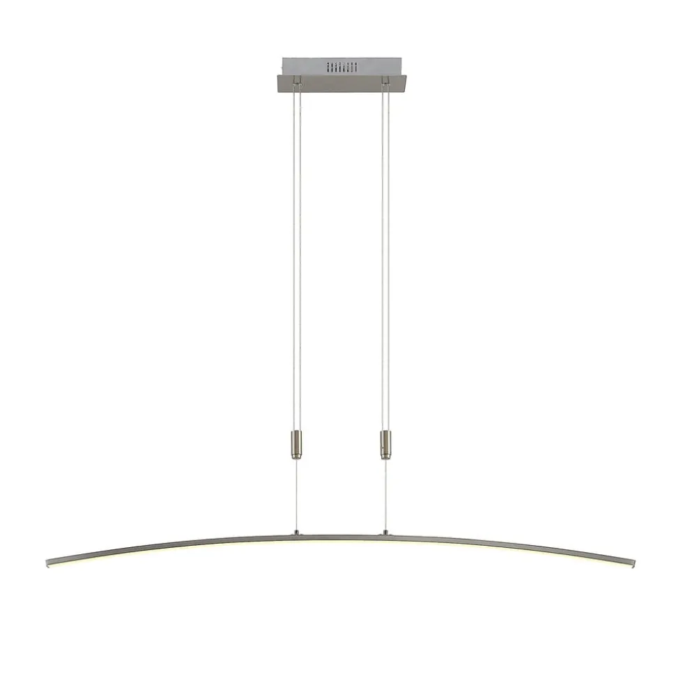 In hoogte verstelbare Phillie LED hanglamp, dimbaarDe moderne Phillie LED hanglamp is ideaal voor het verlichten van een eetkamertafel. Want hij heeft een lang verlichtingselement dat is uitgerust met krachtige leds. Het licht kan via een wandschakelaar in drie stappen worden gedimd. De leds geven een warm licht en dankzij de satijnen afdekking verblindt het licht niet.Het armatuur bestaat uit een hoekige plafondplaat waaraan twee smalle touwen zijn bevestigd. Aan de touwen zitten kleine elementen waarmee de hoogte kan worden aangepast.3-staps-dim uit:Met behulp van een wandschakelaar is het mogelijk om het armatuur gewoon aan en uit te schakelen. De 3-step-dim technologie met geïntegreerde off-functie maakt het ook mogelijk om door meerdere malen op de schakelaar te drukken de armatuur op drie verschillende helderheidsniveaus te dimmen: 100%, 50% en 25%.
