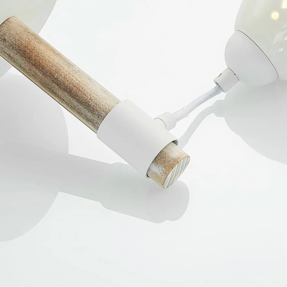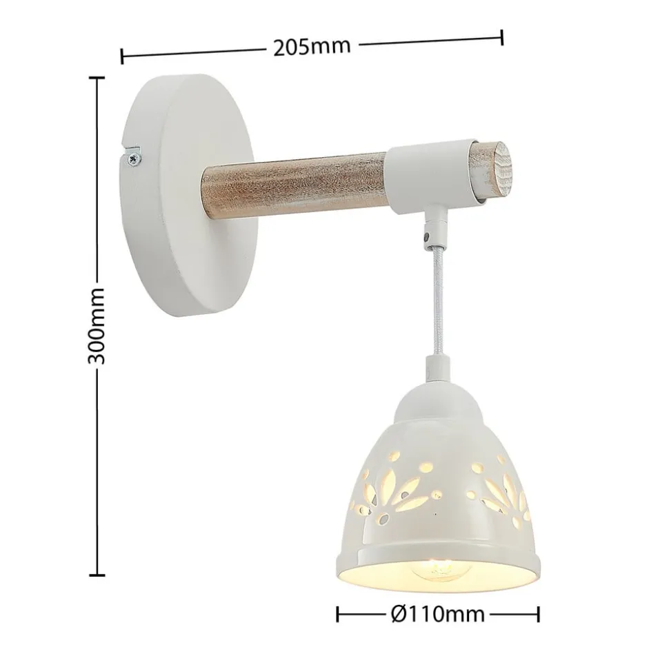 De wandlamp Pimana ziet er zeer decoratief en tegelijkertijd discreet uit aan de wand. Zowel de ronde muurbevestiging als de horizontaal geplaatste lamparm waren gemaakt van staal, waarbij de lamparm was bekleed met een houten decor. De lampenkap is gemaakt van keramiek en is aan de onderkant open. De uitsnijdingen met bloemen zorgen voor bijzondere lichtaccenten in de ruimte en geven deze armatuur een bijzonder karakter.