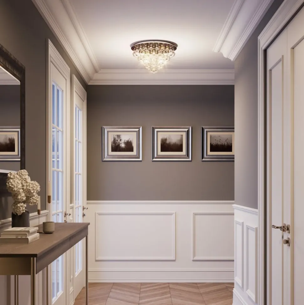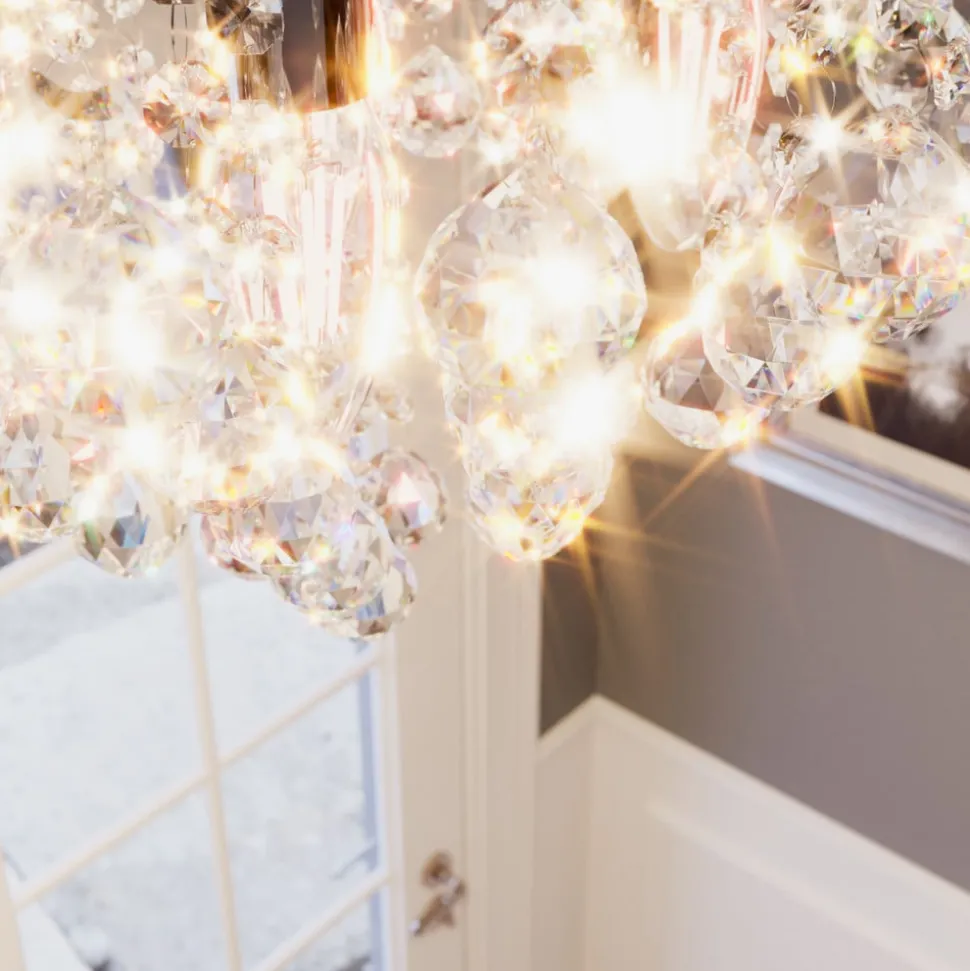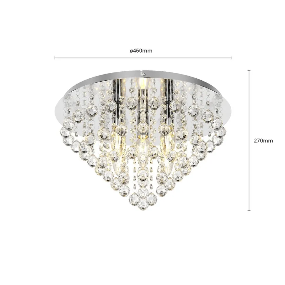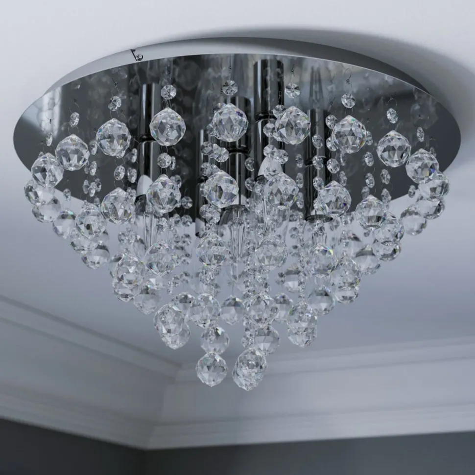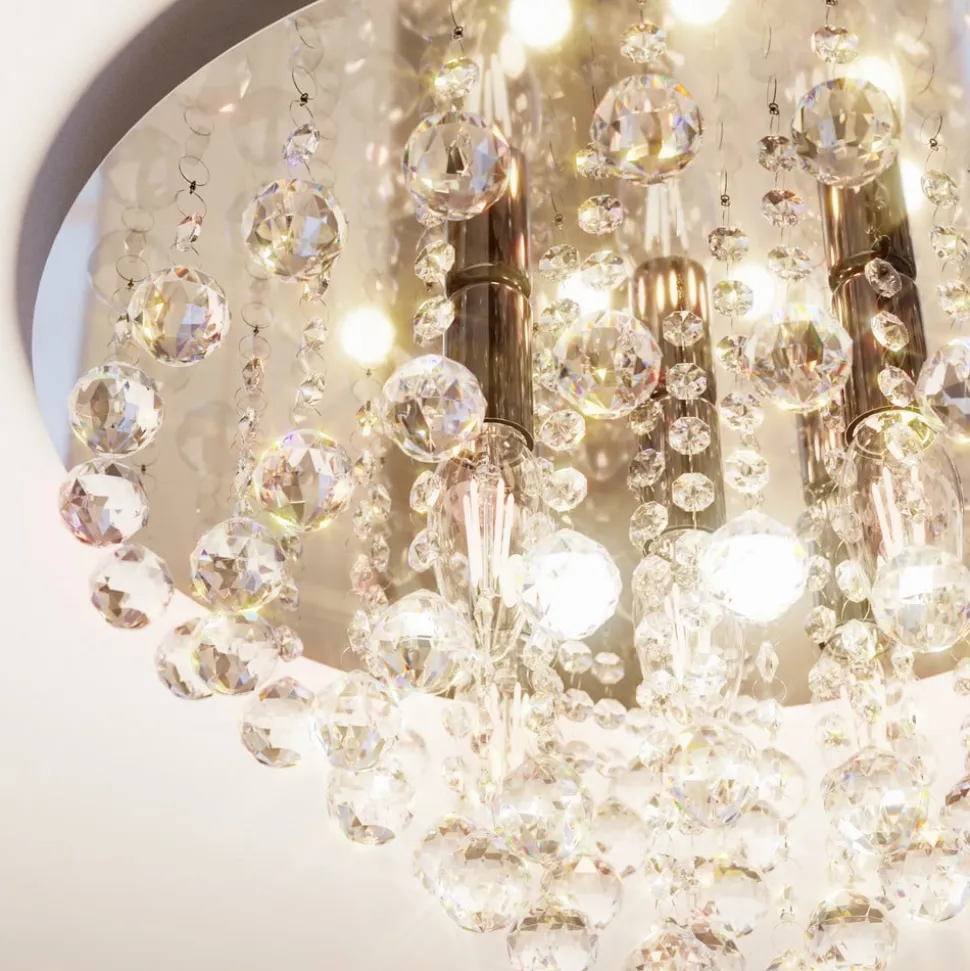 Plafondlamp Annica met verchroomde plafondplaat en glinsterende acrylpendel Annica brengt een bijzondere glamour in moderne woonruimtes, omdat de acrylelementen prachtig gepolijst zijn en daardoor talloze heldere randen bieden om het licht te weerkaatsen. Dit zorgt voor een betoverende glitter wanneer de plafondlamp wordt ingeschakeld, wat meestal als iets heel glamourachtigs wordt ervaren in de hele kamer en bovendien wordt weerspiegeld door het chromen oppervlak.