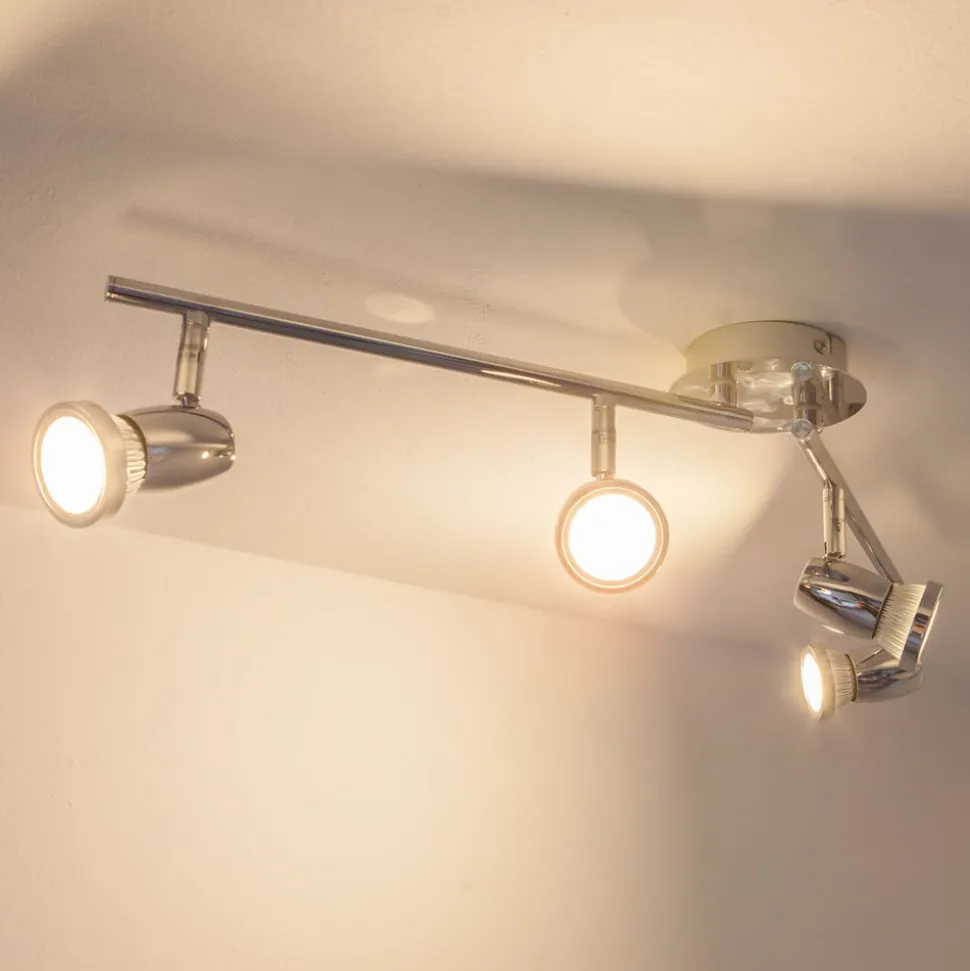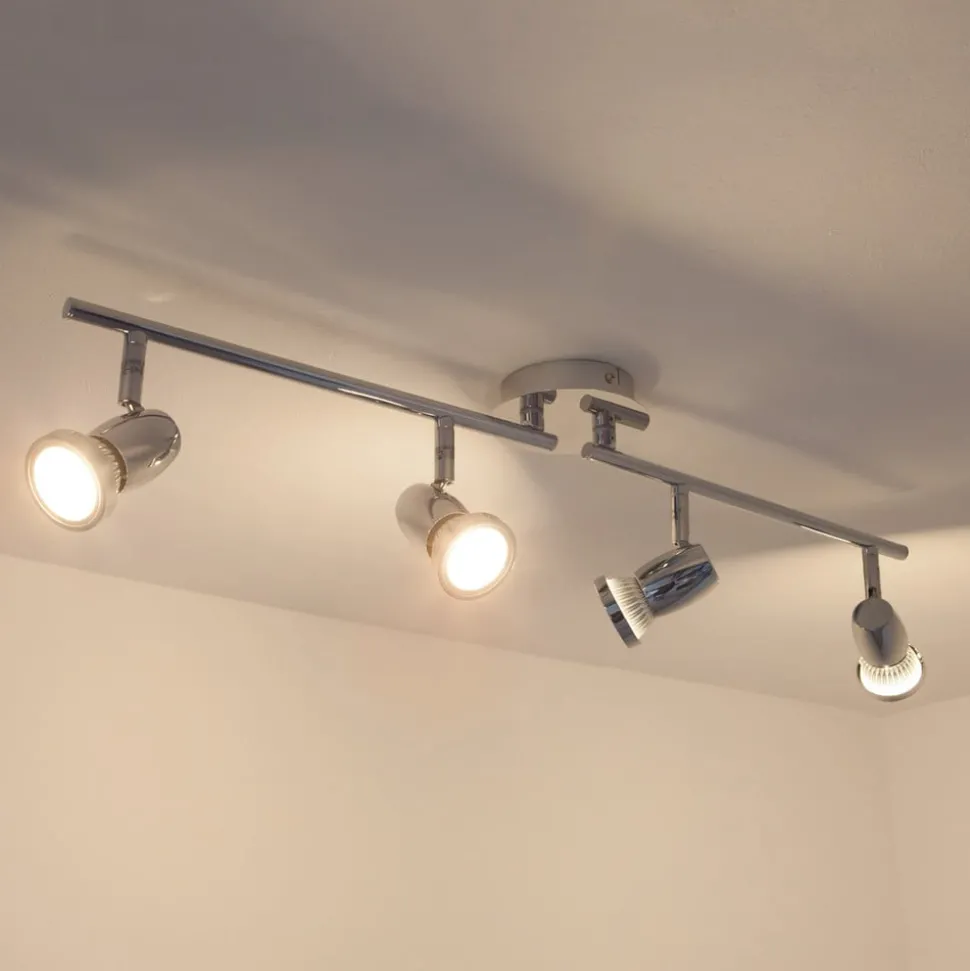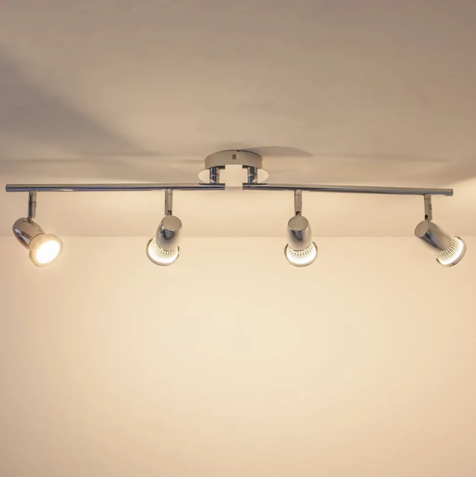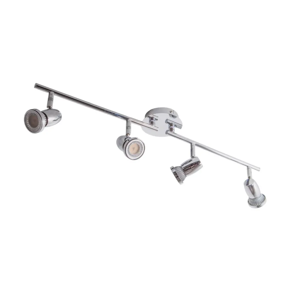 4-lamps Arminius plafondlamp met glanzend chroom oppervlak Arminius is een plafondspot die werkt met GU10 LED lampen, die zowel energiebesparend zijn als een heldere helderheid hebben. Alle afzonderlijke spots kunnen worden gedraaid en gezwenkt voor meer flexibiliteit bij het richten van het licht. Het ontwerp is eenvoudig, modern en teruggebracht tot de essentie, met een glanzend chromen afwerking. De 4-lamps versie van Arminius kan heel goed worden gebruikt als sfeerverlichting in de kamer en de plafondlamp is geschikt voor zowel de keuken als de woonkamer.