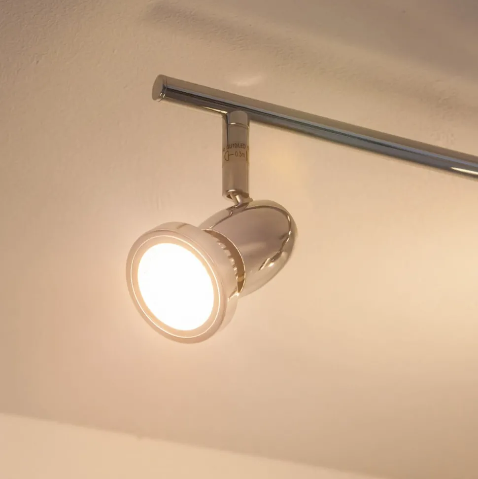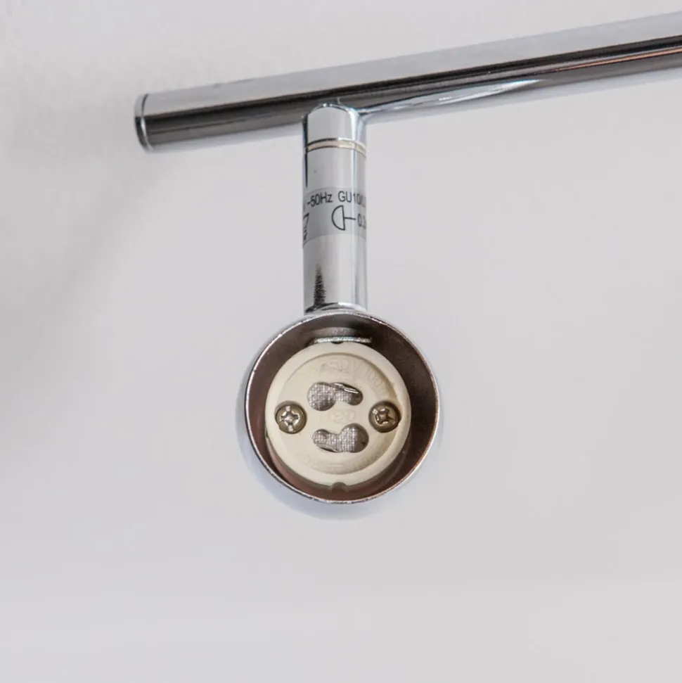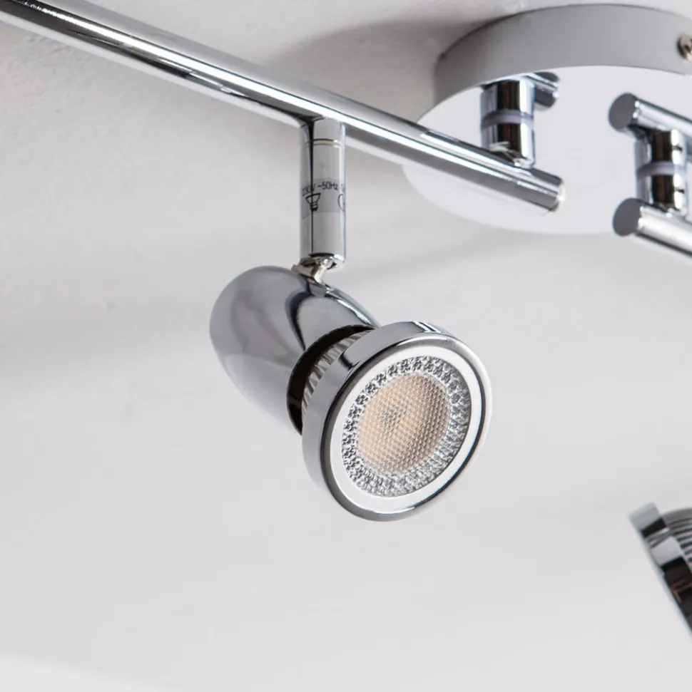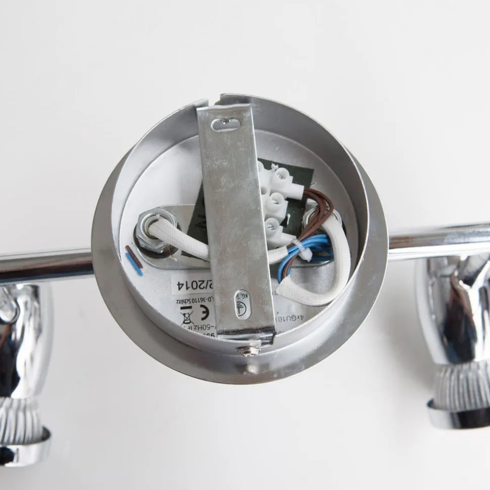 4-lamps Arminius plafondlamp met glanzend chroom oppervlak Arminius is een plafondspot die werkt met GU10 LED lampen, die zowel energiebesparend zijn als een heldere helderheid hebben. Alle afzonderlijke spots kunnen worden gedraaid en gezwenkt voor meer flexibiliteit bij het richten van het licht. Het ontwerp is eenvoudig, modern en teruggebracht tot de essentie, met een glanzend chromen afwerking. De 4-lamps versie van Arminius kan heel goed worden gebruikt als sfeerverlichting in de kamer en de plafondlamp is geschikt voor zowel de keuken als de woonkamer.