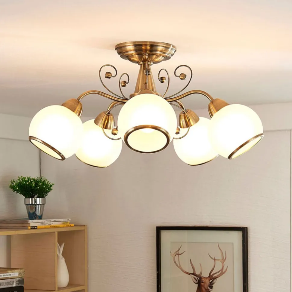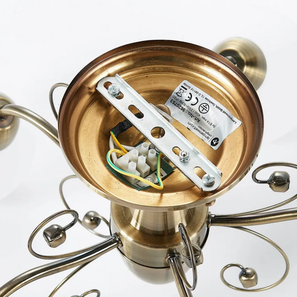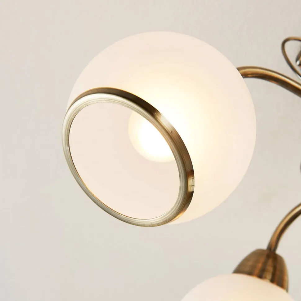 Betoverende plafondlamp Corentin met mooie bolvormige lampenkappen Wie de voorkeur geeft aan een klassieke sfeer met een romantische uitstraling en hiervoor een geschikte plafondlamp zoekt, moet eens een kijkje nemen bij Corentin, want deze ziet er echt magisch uit en het romantische effect is moeilijk te missen! Dit is niet in de laatste plaats te danken aan de oude messingkleurige metalen ranken die het frame tussen de kappen en de plafondhouder aanvullen. Het licht is zeer gelijkmatig, waardoor er een gezellig karakter in de kamer ontstaat wanneer de plafondlamp wordt ingeschakeld.