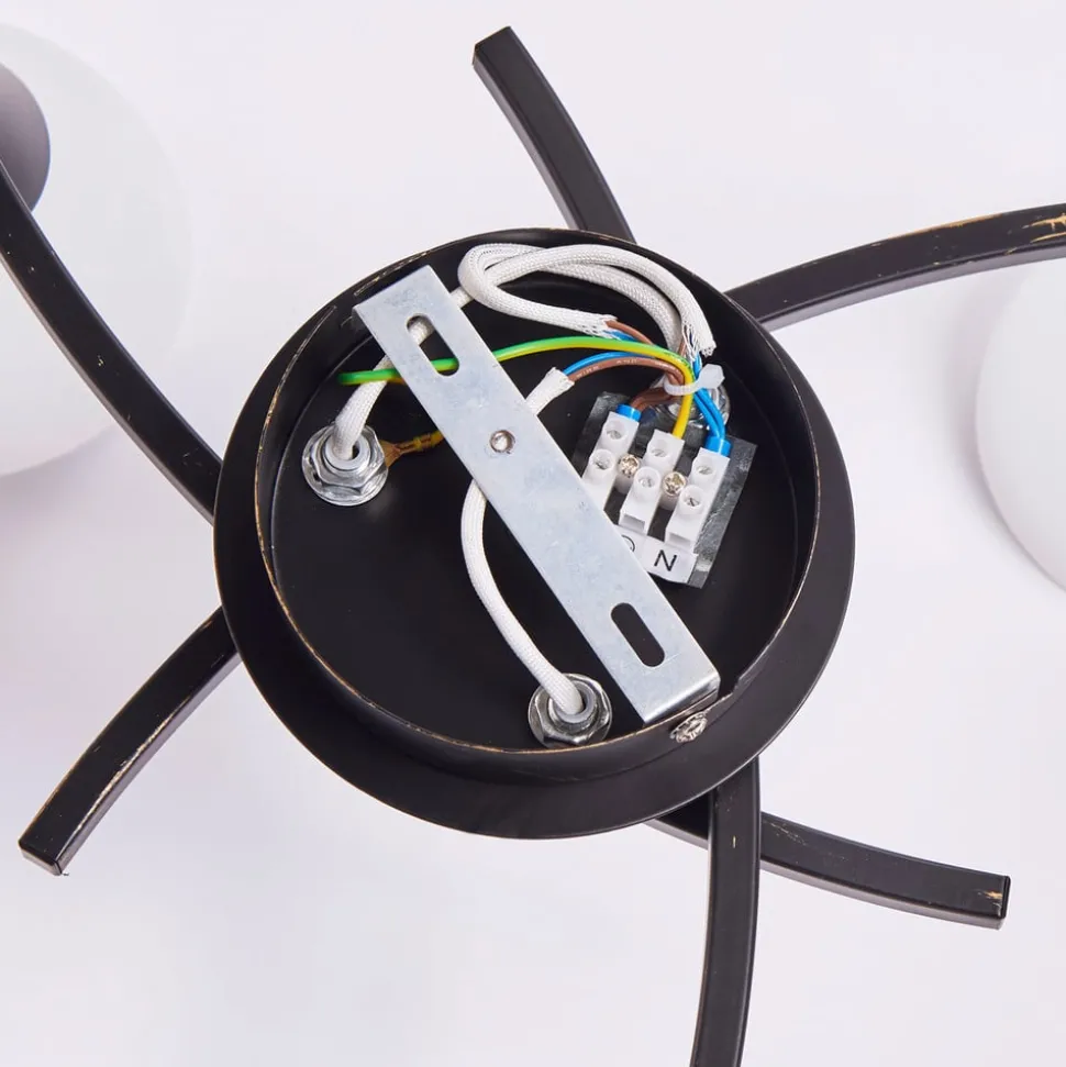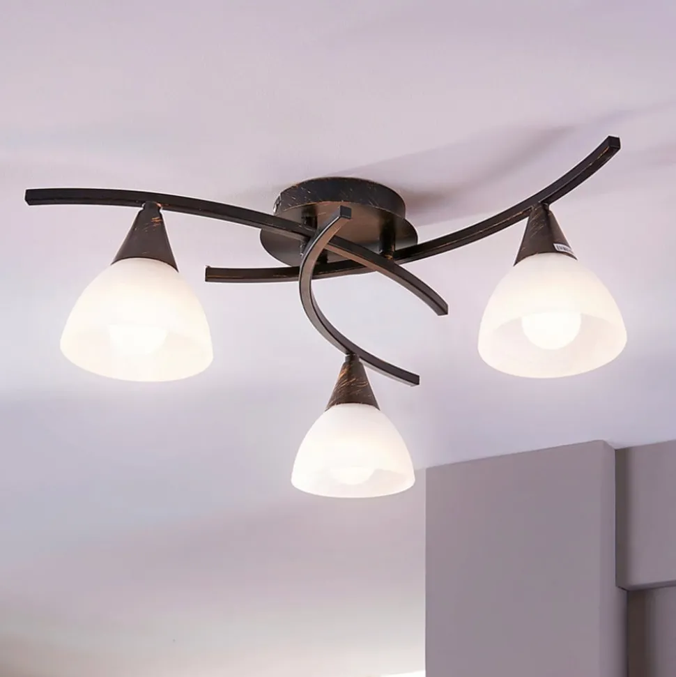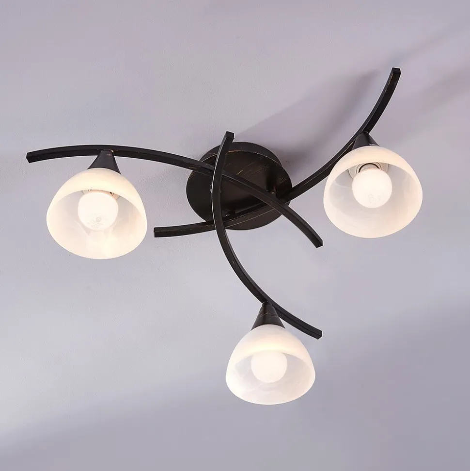 Elegante plafondlamp Della met albastkleurig glas Della bestaat uit witte kappen met een albastkleurige tint en een interessant gevormd frame dat bestaat uit drie gebogen armen. Net als de plafondhouder zijn deze lampenarmen zwart geschilderd en hebben ze een goudkleurige borstelafwerking, die er niet alleen elegant uitziet, maar de plafondlamp ook een iets rustiekere uitstraling geeft. Als plafondlamp combineert Della een helder licht dat geschikt is voor veel woonruimtes met een laag energieverbruik, omdat hier ook energiebesparende LED lampen kunnen worden gebruikt.