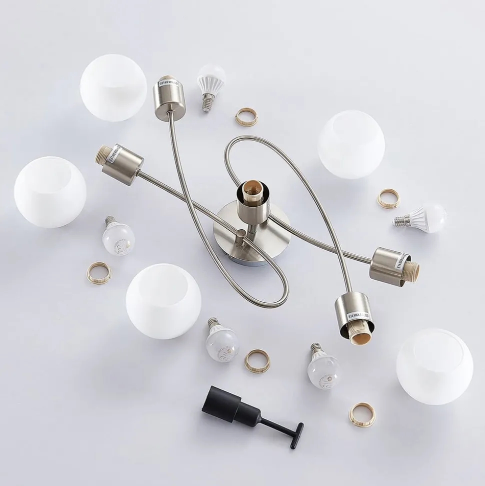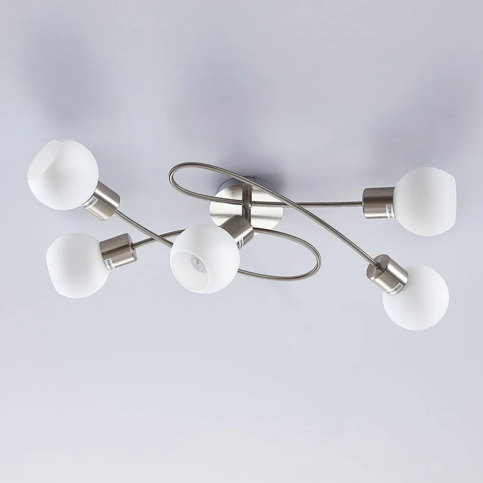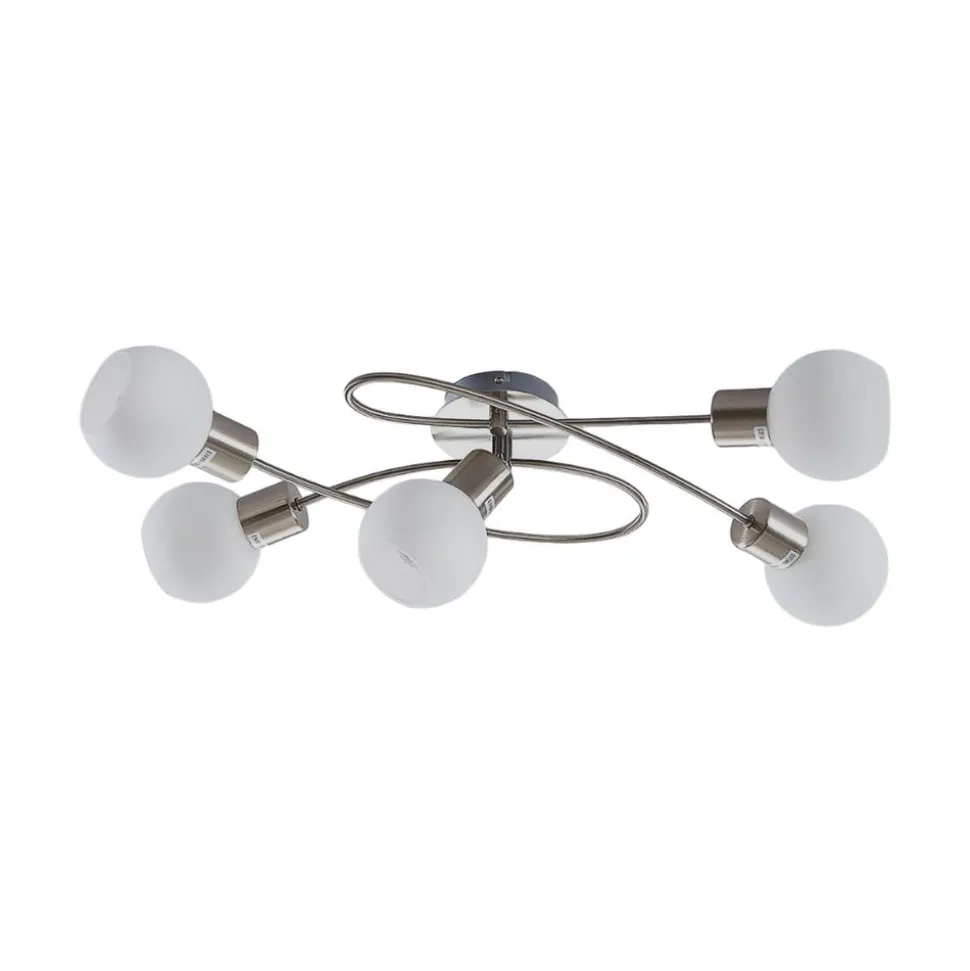 Opalen glazen plafondlamp Elaina met E14 fitting Als plafondlamp is Elaina een uitzonderlijk mooie lichtbron voor woonruimtes die in een moderne stijl zijn ingericht. Uitgerust met 5 opaalglazen bollen, waarachter telkens een E14 lamp kan worden gestoken, produceert de plafondlamp een aangenaam helder licht dat in veel kamers past. Het gedurfd gedraaide metalen frame met een matte nikkelafwerking is bijzonder aantrekkelijk en geeft de plafondlamp een dynamische uitstraling.