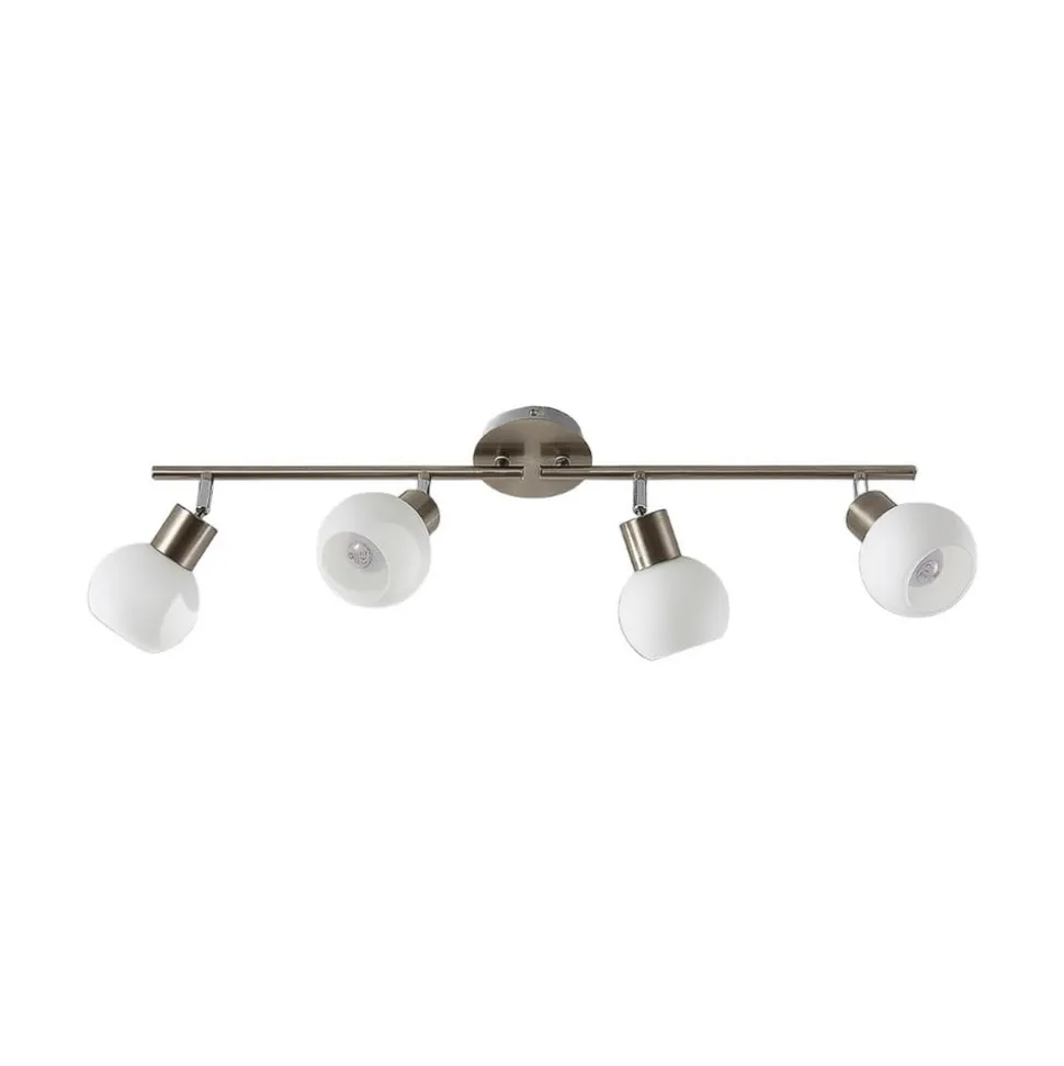 4-lamps Elaina plafondlamp met witte opalen glazen kappen Het armatuur kan worden uitgerust met vervangbare retrofit lampen voor de E14 fitting, die een laag energieverbruik hebben. Het frame van deze plafondlamp, die ideaal is voor de woonkamer, heeft een matte nikkelafwerking en de bolvormige glazen kappen zijn wit. De twee armen van het frame kunnen worden verplaatst.