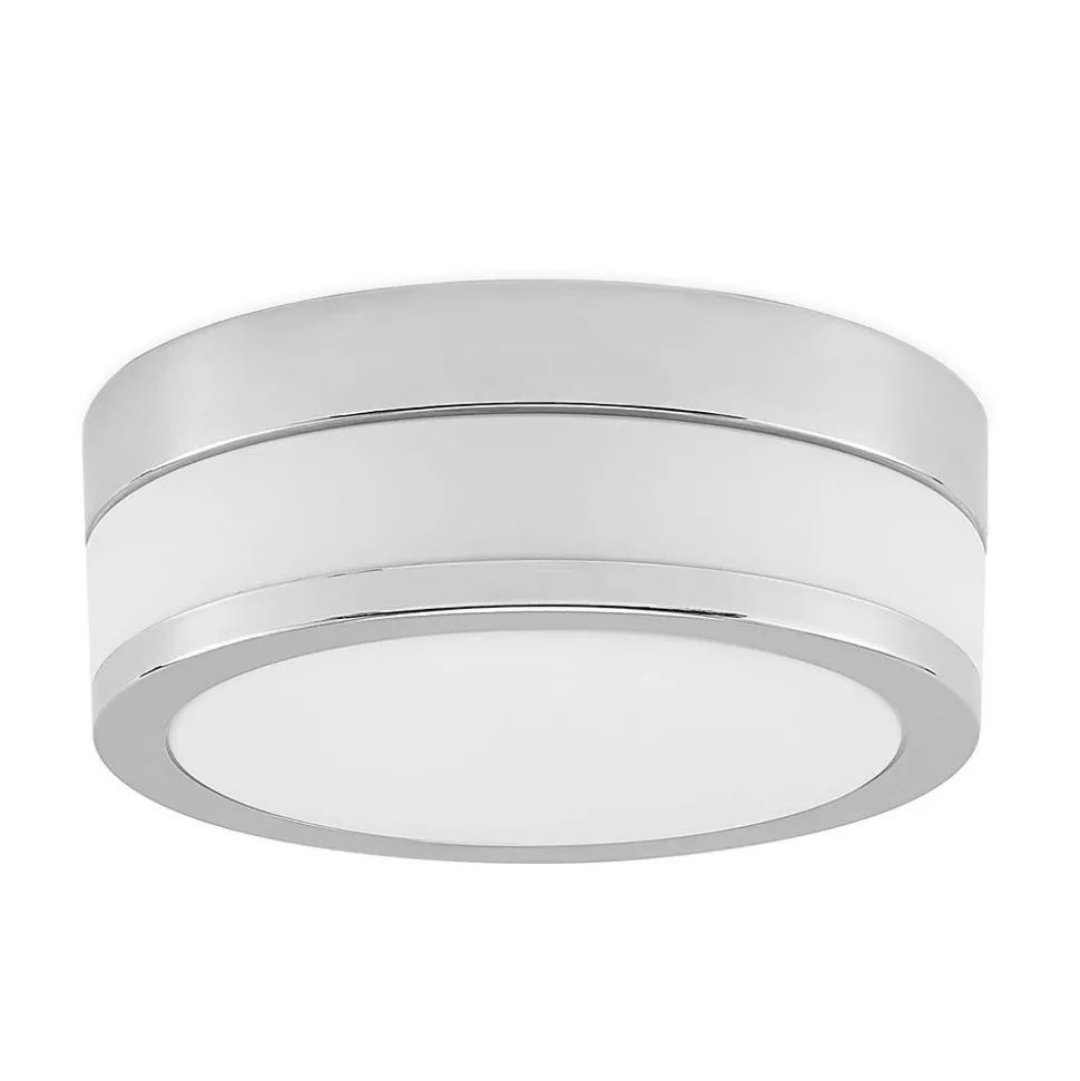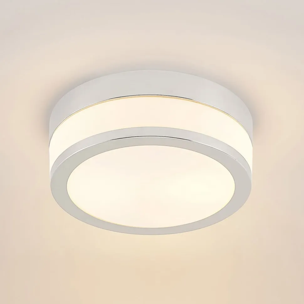 Ideaal voor gebruik in de badkamer: de plafondlamp Flavi met opaalwitte glazen kap Als je er zeker van wilt zijn dat je een plafondlamp zonder aarzeling in de badkamer kunt gebruiken, moet je ervoor zorgen dat deze een IP44 beschermingsgraad heeft, zoals de plafondlamp Flavi. Het ontwerp van Flavi is eenvoudig en onopvallend modern. De opaalwitte glazen kap wordt aangevuld met een metalen ring – twee materialen die goed bij elkaar passen.
