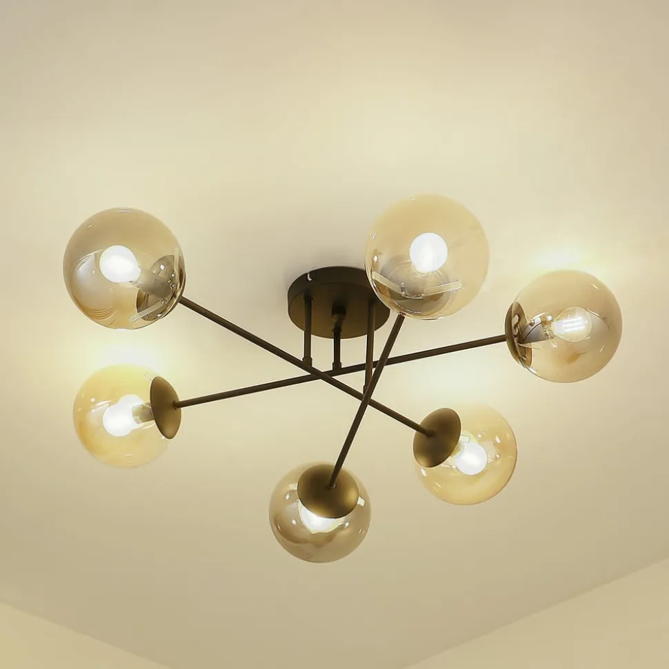 Plafondlamp Isamer: elegantie in rookgrijs en amber Ervaar hoe plafondlamp Isamer je woon- of eetkamer verandert in een oase van rust en inspiratie. Dit armatuur, ontworpen in een moderne stijl, brengt niet alleen licht maar ook een sfeer van elegantie in elke ruimte. Het subtiele rookgrijze en amberkleurige kleurenschema creëert een warme, uitnodigende sfeer die uitnodigt om te blijven hangen. Hoewel deze plafondlamp niet is uitgerust met een geïntegreerde dimmer, kan deze eenvoudig worden gecombineerd met een externe dimmer om de helderheid naar wens aan te passen en zo de gewenste sfeer te creëren.