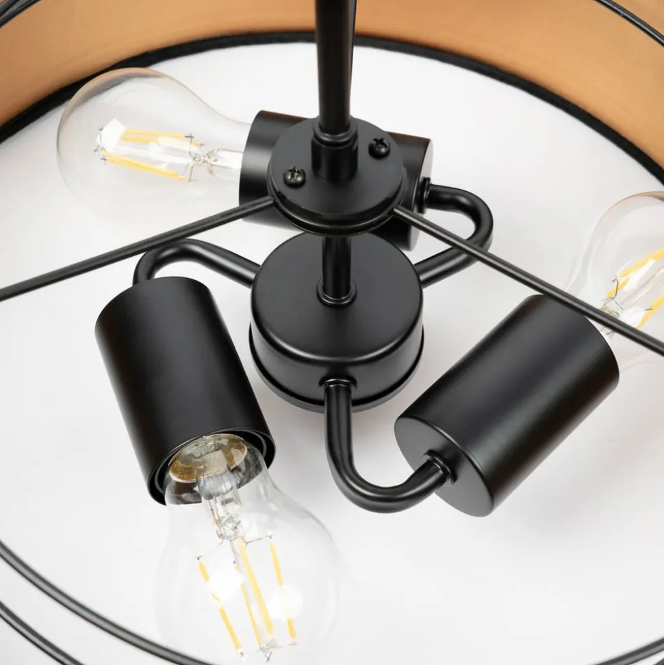 Donkere Jusari plafondlamp met een textielen kap gemaakt van verschillende lagen De Jusari plafondlamp is verkrijgbaar in een zwarte versie met een gouden kap aan de binnenkant. Deze kleurencombinatie ziet er trendy en elegant tegelijk uit. Het bijzondere aan deze lamp is dat de kap bestaat uit drie asymmetrische textielen kappen die in lagen over elkaar heen liggen. Dit geeft deze plafondlamp een interessant karakter dat gemakkelijk kan worden geïntegreerd in met name moderne stijlen.