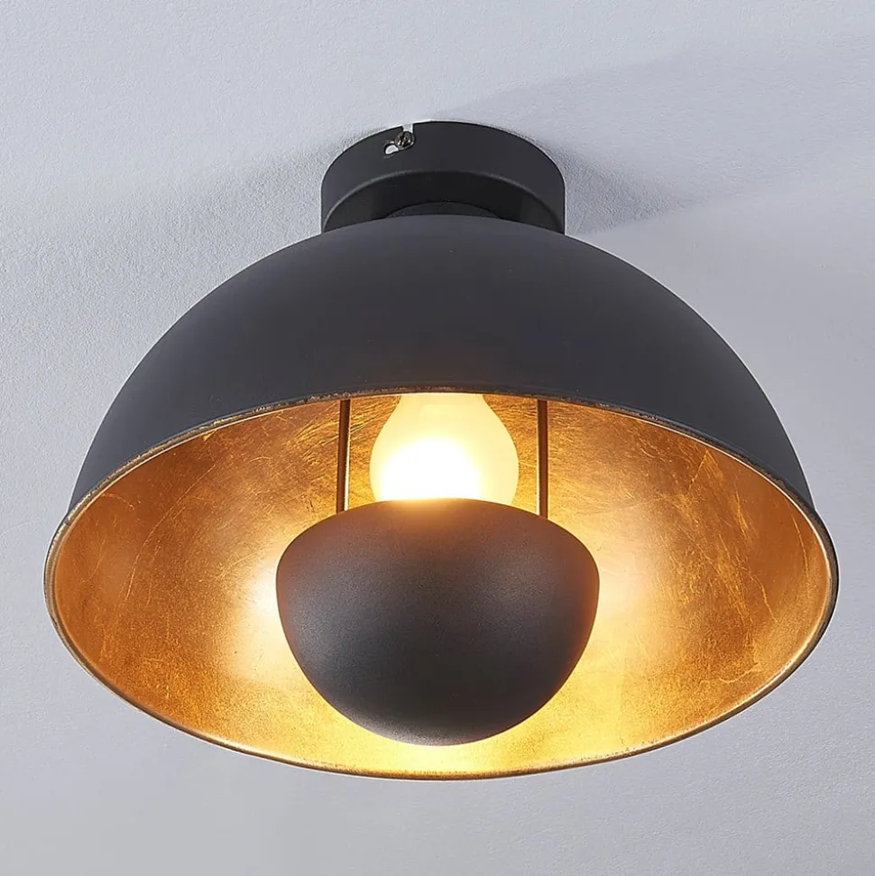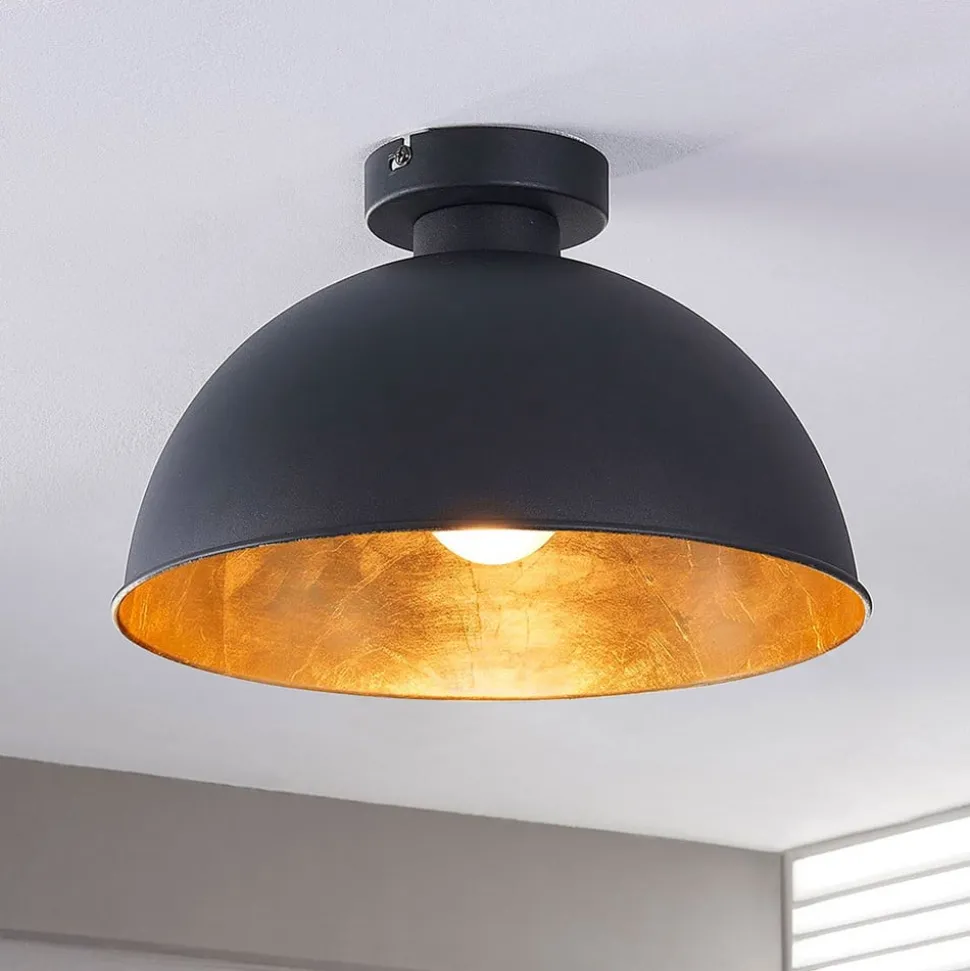 Lya – aantrekkelijke plafondlamp met zwarte buitenkant en gouden binnenreflector Zelfs als je het op het eerste gezicht niet zou denken, gaan de kleuren goud en zwart heel goed samen, vooral als het gaat om moderne interieurs. Deze kleurencombinatie creëert een samenspel van elegante koelte en een zeer warme gloed in combinatie met verlichting. Dit is ook het geval bij plafondlamp Lya, die een koepelvormige kap heeft die aan de buitenkant matzwart is geschilderd en aan de binnenkant is afgewerkt met matgoudfolie. Bovendien zit er een reflectorlamp in de kap die het licht van de lamp afschermt, waardoor een overwegend indirect licht ontstaat dat de kamer op een gezellige manier overspoelt. Lya is geschikt als lichtbron voor de slaapkamer, maar kan natuurlijk ook worden gebruikt voor uitnodigende verlichting in de woonkamer of hal.