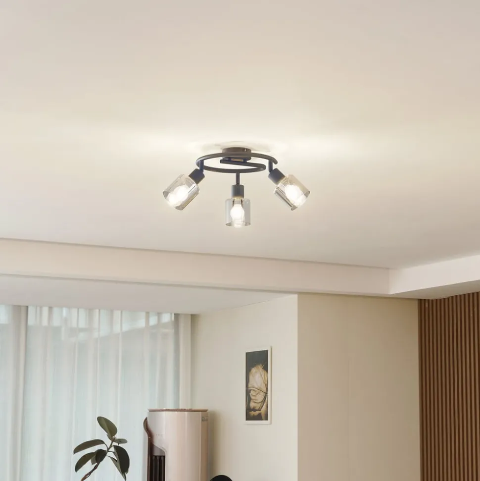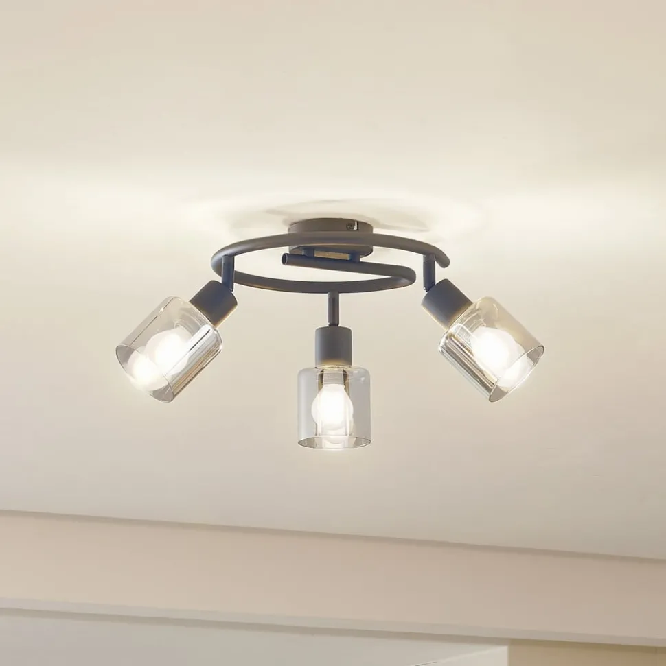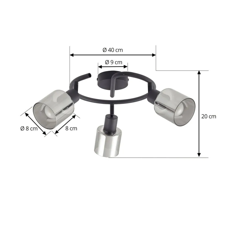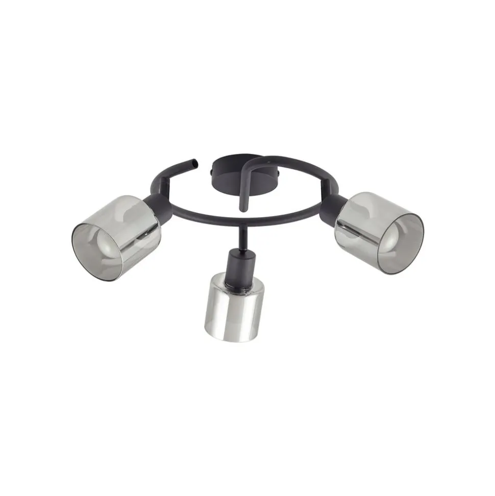 3-lamps plafondlamp Netty met rookgrijze kap De plafondlamp Netty combineert modern design met de elegantie van rookgrijs glas om een sfeer te creëren die zowel gezellig als inspirerend is. Dit verlichtingselement is ideaal voor gebruik in de eetkamer, woonkamer of hal en plaatst stijlvolle accenten en helpt de productiviteit te verhogen. De lichtbron is niet alleen een visuele blikvanger, maar beïnvloedt ook de stemming in de kamer door te variëren van kalmerende tot opwekkende nuances. Hoewel er geen dimmer wordt meegeleverd, kan de intensiteit van het licht via een externe dimmer worden aangepast aan individuele voorkeuren om de perfecte sfeer te creëren (let op: een externe dimmer moet apart worden aangeschaft) – de spots kunnen 90° worden gedraaid en 350° worden gedraaid