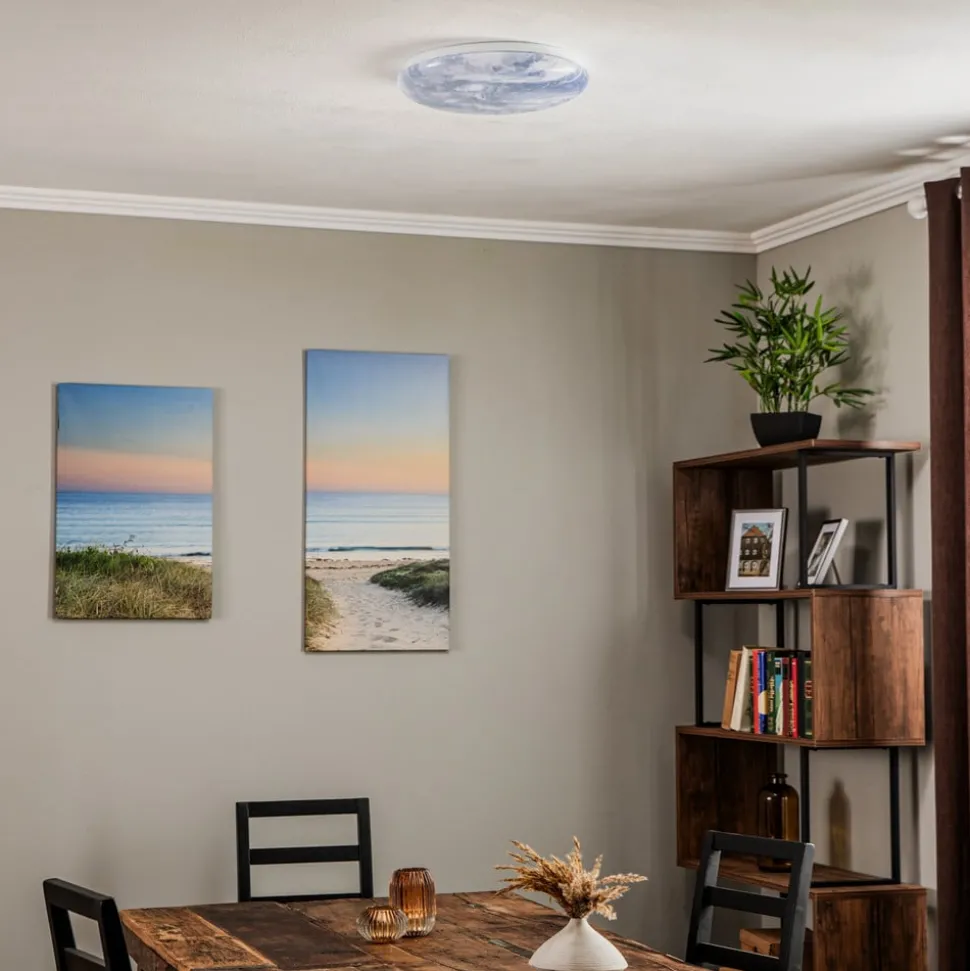 Ronde LED plafondlamp met aardeprint De Orbi LED plafondlamp heeft een bijzonder design. De ronde kunststof diffuser heeft een aardeprint, waardoor het lijkt alsof er een gloeiende bol op het plafond is aangebracht. De lamp is verder veelzijdig en biedt energiezuinig, praktisch licht in elke kamer.