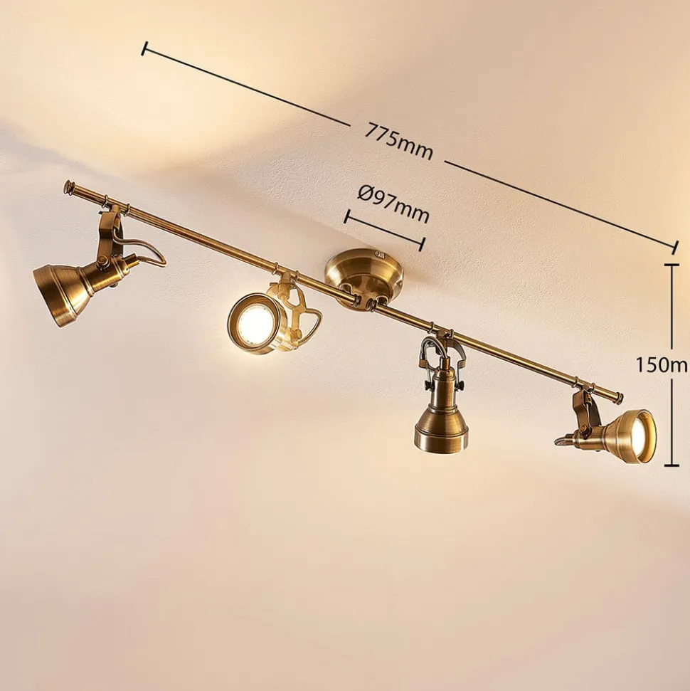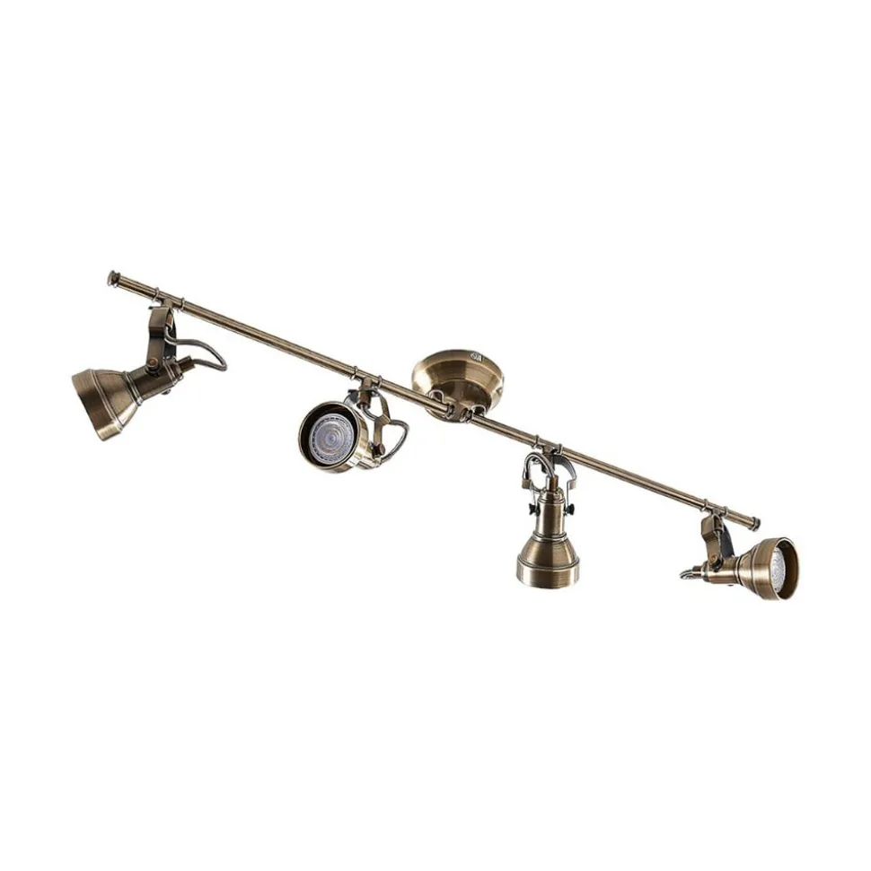 Prachtige Perseas plafondlamp met antiek messing oppervlak voor GU10 lampen Perseas is ideaal voor gebruik als woonkamerverlichting en zorgt voor een brede verlichting. De plafondlamp bestaat uit vier afzonderlijke spots die elk afzonderlijk kunnen worden gedraaid en gezwenkt. Met haar antiek messing afwerking heeft de plafondlamp een klassiek effect, waardoor ze goed past bij overeenkomstige inrichtingsstijlen.