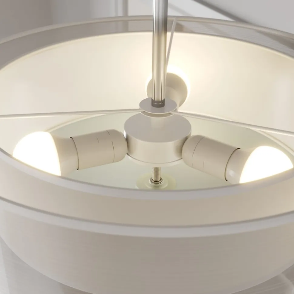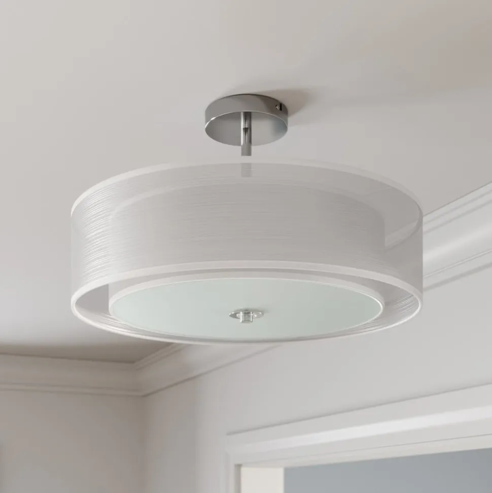 Mooie stoffen plafondlamp Pikka in wit De stoffen plafondlamp Pikka wordt bediend met E27 lampen. De kap van de stoffen plafondlamp, die op een kleine afstand aan het plafond is bevestigd, ziet er zo elegant uit omdat het eigenlijk twee kappen zijn die effectief tot één kap zijn gecombineerd. De buitenste kap is transparant en gemaakt van organza stof, terwijl de binnenste kap gemaakt is van een stevigere stof. Aan de onderkant van de binnenste lampenkap is ook een plaat van wit glas bevestigd, zodat het licht zacht wordt gedimd en een bijzonder gezellig effect heeft.