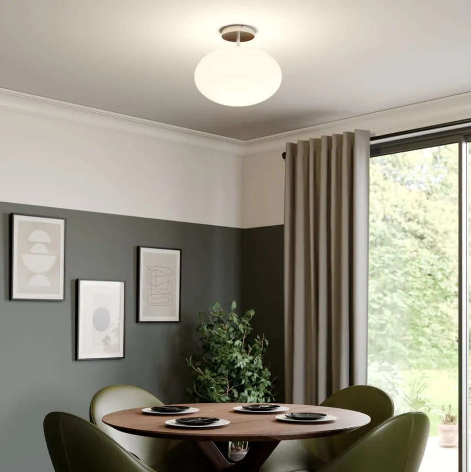 Elegante Sonika plafondlamp met glazen kap Deze prachtige plafondlamp maakt over de hele linie indruk met haar ongerepte en moderne ontwerp. Het ijzeren frame heeft een trendy nikkelen afwerking. Op de voorgrond staat echter de uitgestrekte kap. Deze is volledig gemaakt van glas met een opale, matte look die meteen boeit. De grote, ovale vorm lijkt bijna net zo licht als een wolk die aan het plafond lijkt te zweven. Het matte oppervlak werkt ook als een diffuser, waardoor het licht gelijkmatig en zonder verblinding wordt verspreid. Als Sonika is uitgerust met een dimbare lamp, kan de helderheid worden aangepast aan individuele behoeften met behulp van een standaard wanddimmer (dimmer niet inbegrepen).