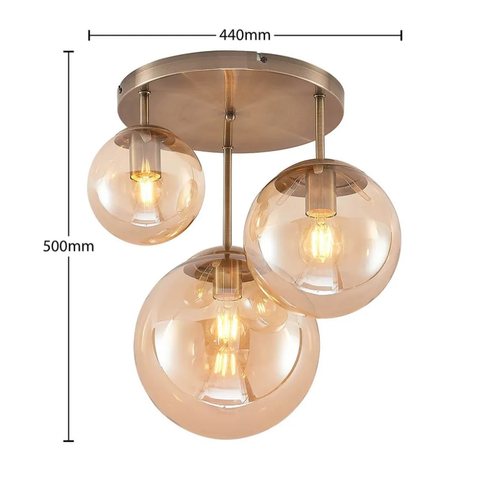 3-lamps Teeja plafondlamp met ronde plafondhouder in antiek messing en amberkleurige glazen kappen De plafondhouder van deze lamp heeft een elegante afwerking in antiek messing, terwijl de glazen kappen in de vorm van bollen in amber zijn en daardoor een bijzonder warm licht kunnen creëren. Het oppervlak is echter in principe helder, zodat de lampen nog steeds gemakkelijk te herkennen zijn, zowel in als uitgeschakeld. Het is daarom raadzaam om bijzonder decoratieve lampen te kiezen, zoals filament of rustieke lampen, die meestal ook energiebesparende LED technologie hebben. De ronde kappen, die op bollen lijken, variëren in grootte en hangen op verschillende hoogtes aan de plafondplaat. Dit resulteert in een individuele, iets dynamischere uitstraling. Het armatuur slaat overal in de woonkamer een goed figuur en ziet er ook altijd goed uit als gangverlichting.