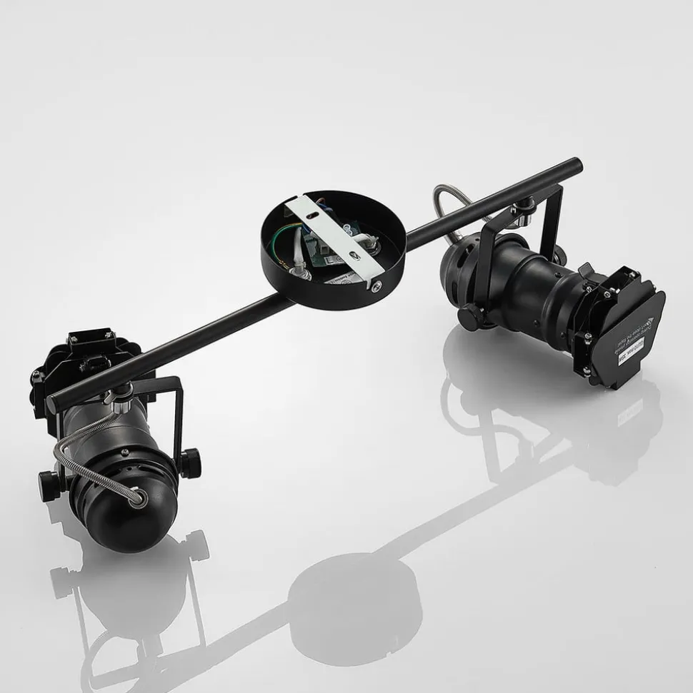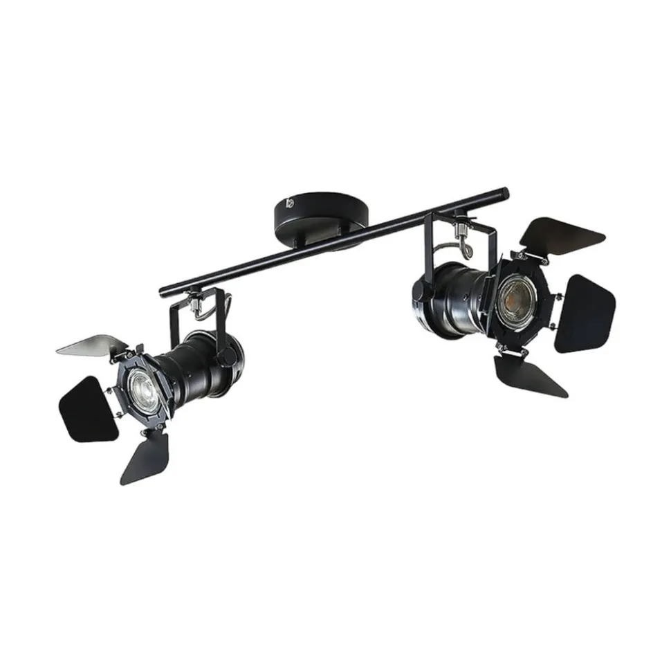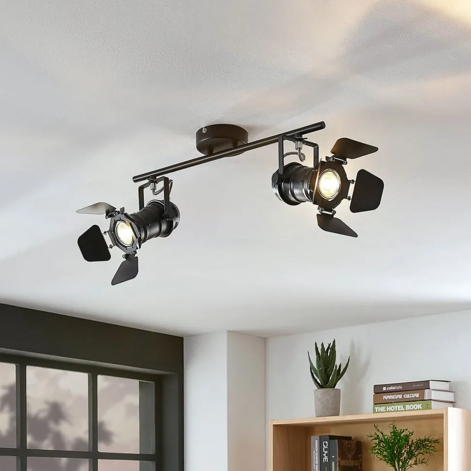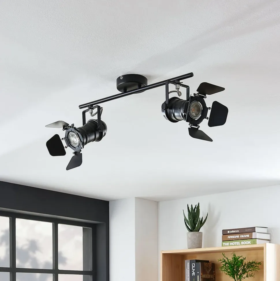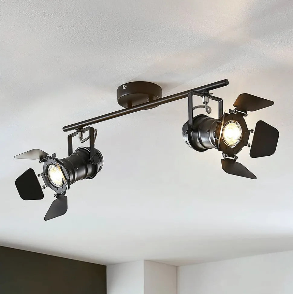Tilen – 2-lamps plafondlamp met spots in spotstijl De moderne Tilen plafondlamp is een lichtbron en bijzondere blikvanger in één. De twee spots zijn ontworpen in de stijl van oude spots en zijn ook uitgerust met de typische kleppen. Deze hebben hier echter meer een decoratieve functie, maar zijn nog steeds individueel verstelbaar. De twee spots zelf zijn ook verstelbaar en kunnen gedraaid en gekanteld worden om elke hoek van de kamer te verlichten. Tilen is moderne verlichting voor woonkamers, gangen en eetkamers.