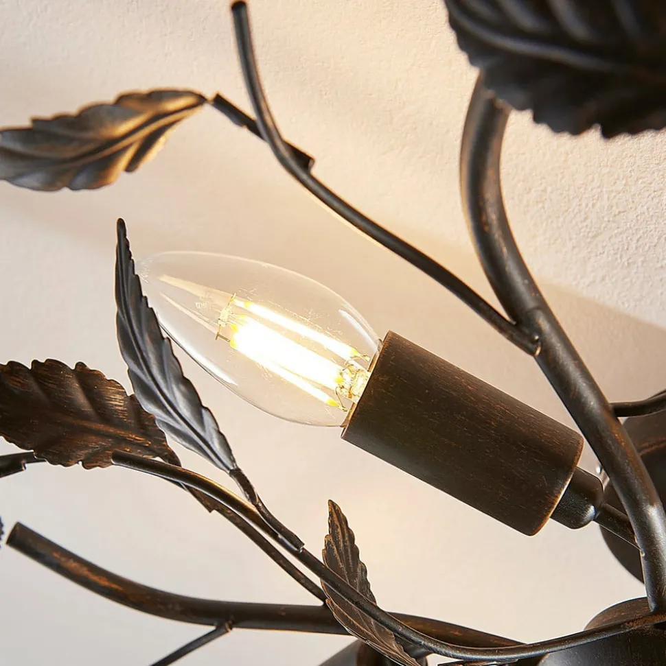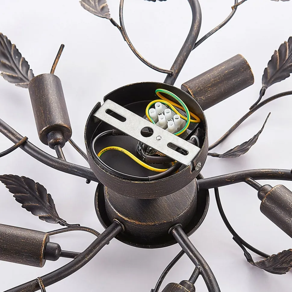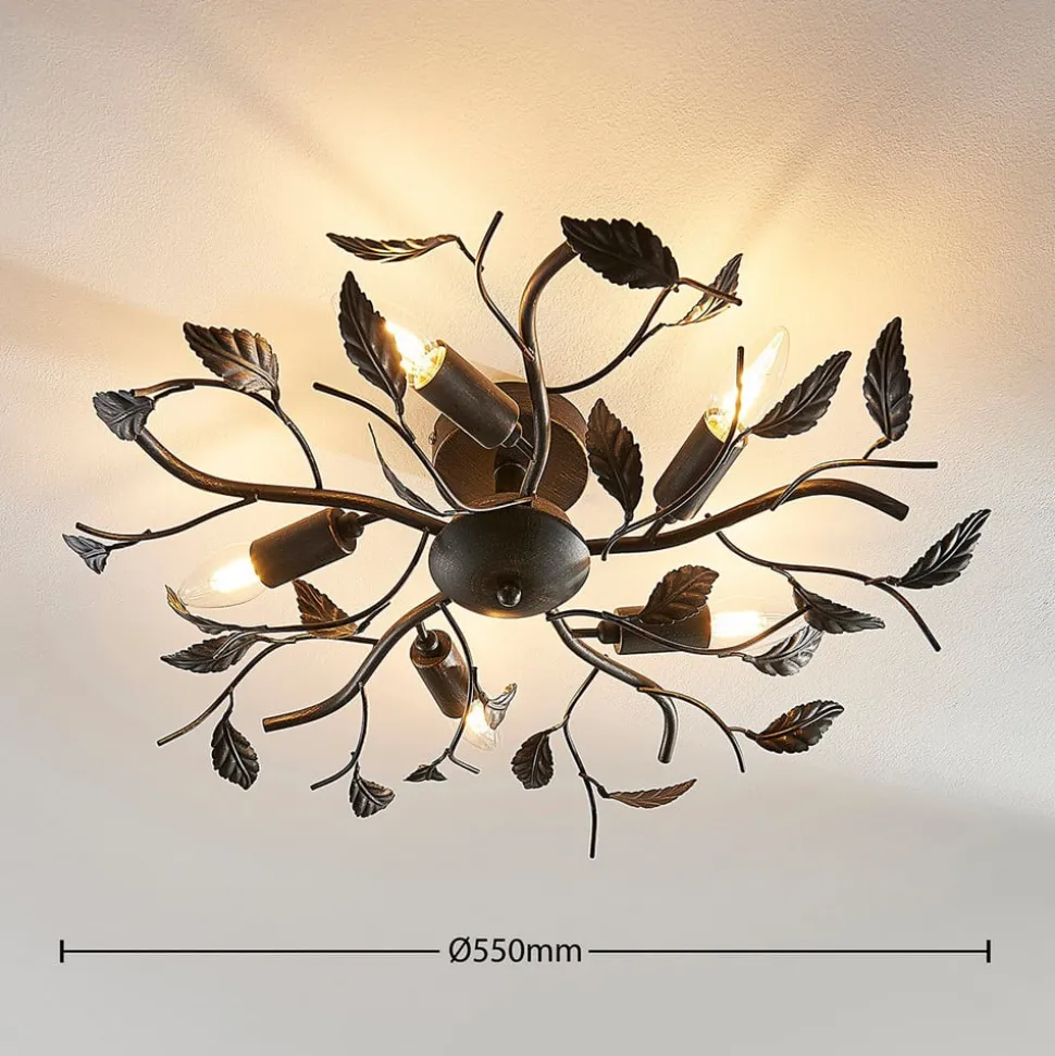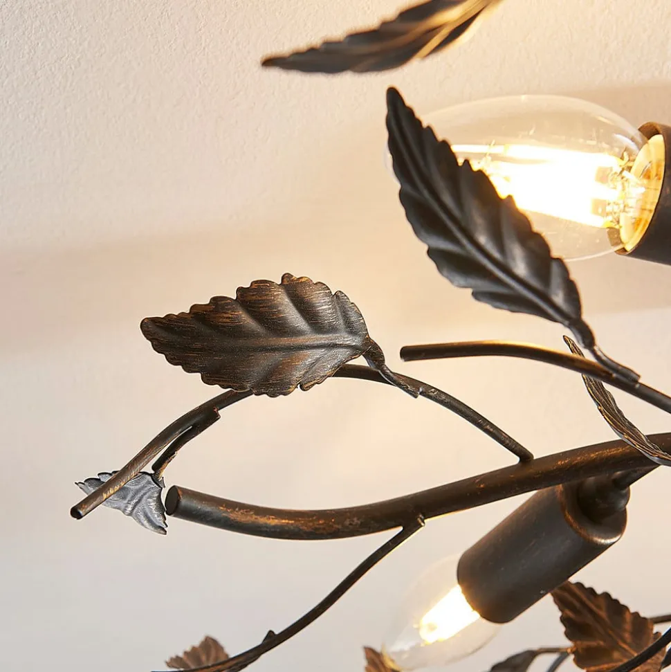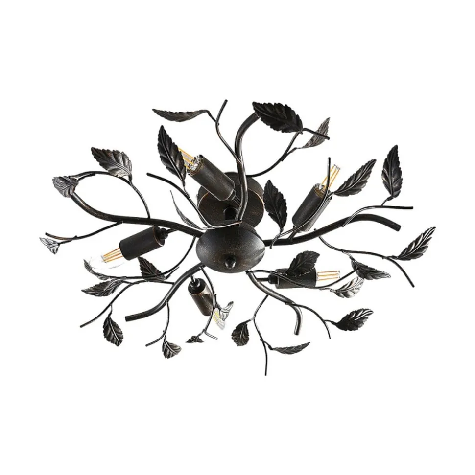 Prachtige plafondlamp Yos met metalen bladdecoratie Yos is een plafondlamp die vooral bedoeld is voor het verlichten van klassieke interieurs. De plafondhouder bevindt zich in het midden en vanuit dit midden steken vele met bladeren versierde metalen takken naar buiten. De bladeren van de plafondlamp hebben een zwarte achtergrond en zijn afgewerkt met fijne koperen penseelstreken. Deze afwerking creëert een antieke look en Yos is ook geschikt voor een romantische verfraaiing van de woonkamer. Het lichtbeeld profiteert ook op een speelse manier van de fijne takken, want er ontstaat een indrukwekkend spel van licht en schaduw.