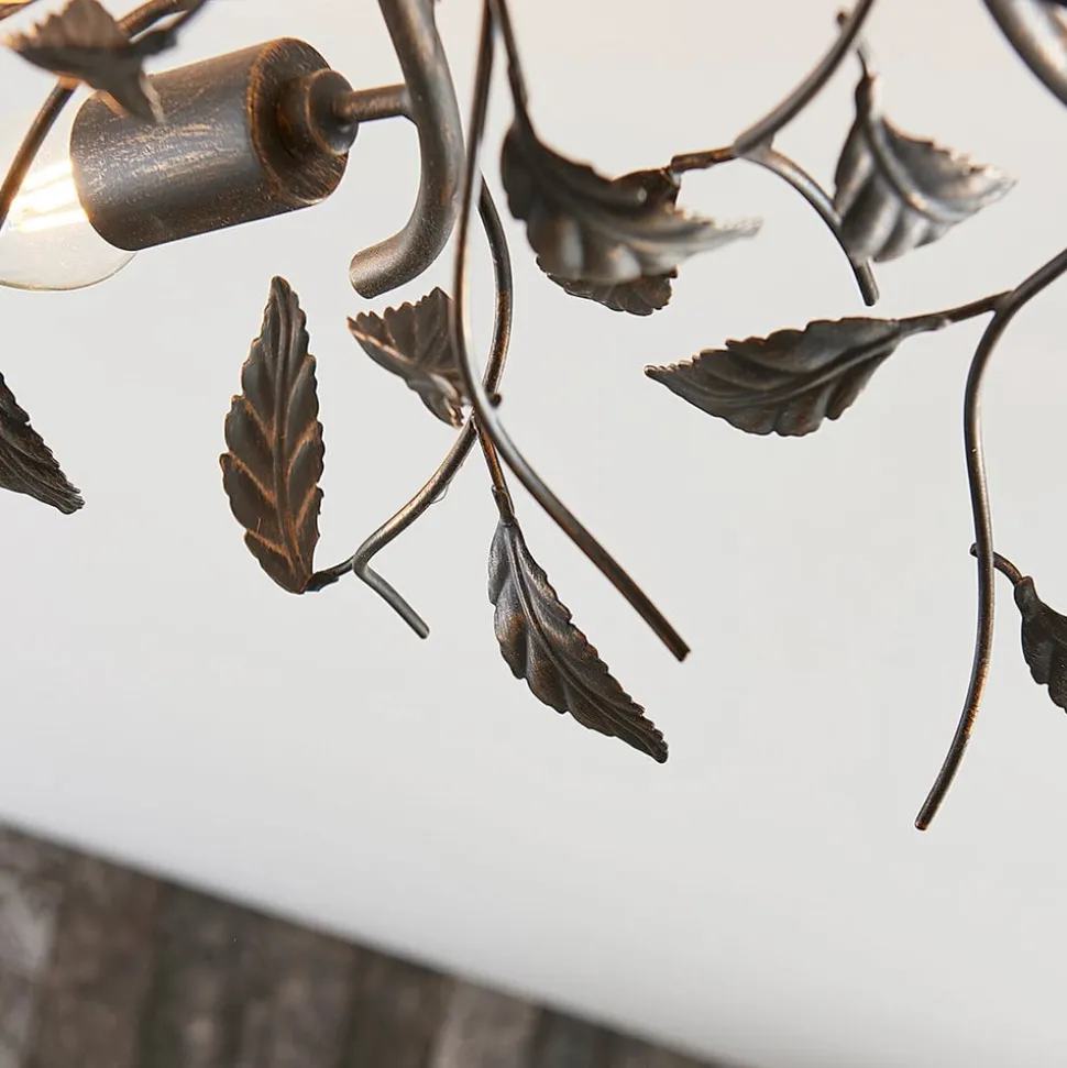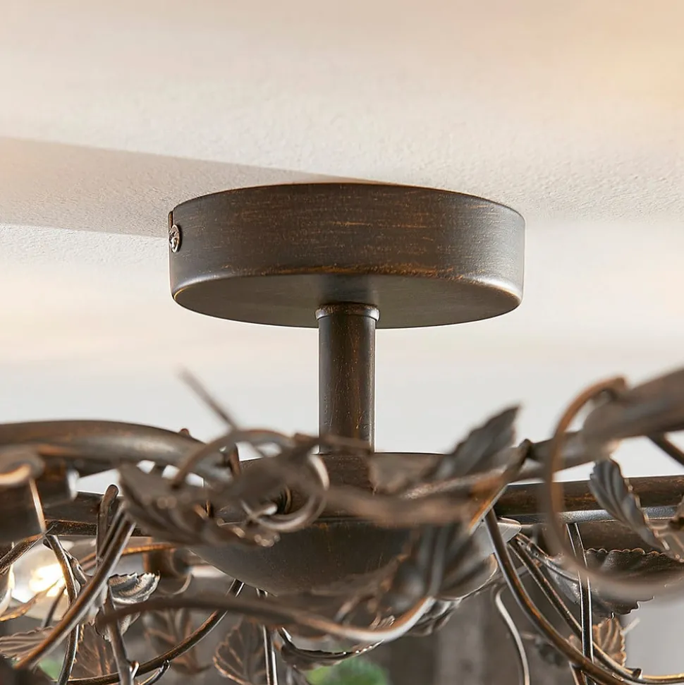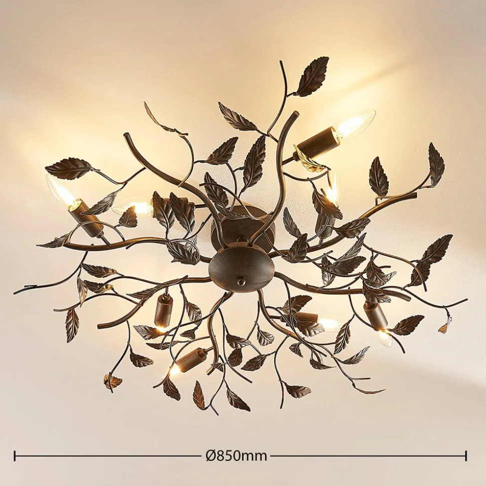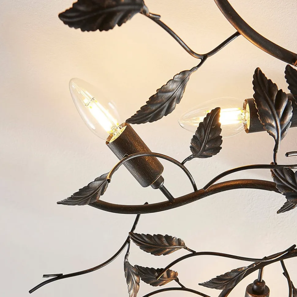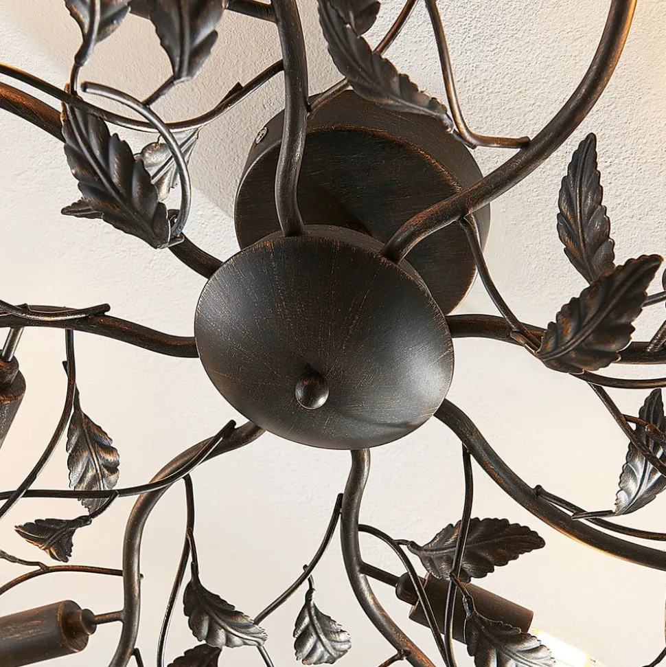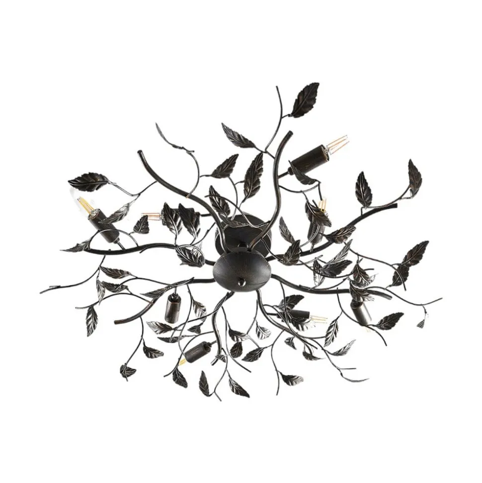 Ronde metalen plafondlamp Yos met romantische takken van metaal Yos kan bijzonder goed worden geïntegreerd in klassiek ingerichte woonkamers, omdat de plafondlamp iets romantisch uitstraalt en indruk maakt met zijn speelse uitdrukking. Het metalen frame van de plafondlamp doet denken aan de delicate vertakkingen van een tak versierd met bladeren. Deze bladeren zijn hier niet groen, maar hebben de basiskleur zwart en een fijne afwerking van koperen penseelstreken. Deze look kan ook geïnterpreteerd worden als een antieke look en benadrukt de speelse uitstraling van de metalen plafondlamp.