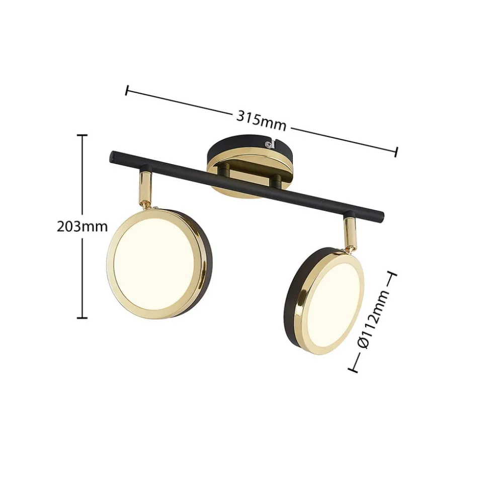 2-lamps plafondspot Alsani in zwart en goud Deze speciale spot maakt indruk met een geraffineerde look die voortkomt uit de stijlvol gekozen kleurencombinatie. De zwarte oppervlakteafwerking wordt benadrukt door gouden elementen, waardoor een hoogwaardige indruk ontstaat. Dit design komt bijzonder goed tot zijn recht in kamers met een moderne inrichting. De positie van de twee spots kan flexibel worden aangepast, zodat ze kunnen worden gebruikt om specifieke delen van een kamer te benadrukken. De meegeleverde GX53 lampen zijn zuinig in stroomverbruik dankzij hun LED technologie. Alsani is een prachtig woonaccessoire voor eigentijdse interieurs!