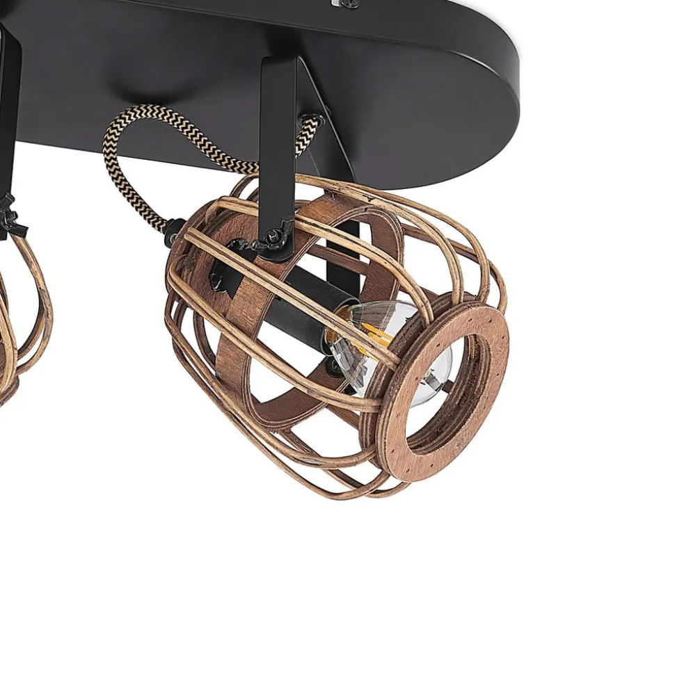 Langwerpige Bominio plafondspot met flexibele rotan kappen De Bominio plafondspot maakt indruk met zijn stijlvolle materiaalcombinatie van zwart staal en lichtgekleurd rotan, die zeer goed met elkaar harmoniëren, waardoor de armatuur zelfs in uitgeschakelde toestand een echte blikvanger aan het plafond is. De kappen hebben dunne steunen die een bijna onbelemmerd zicht op de lichtpunten mogelijk maken. De gebruikte lampen moeten daarom decoratief zijn om de speciale uitstraling van dit armatuur te benadrukken.