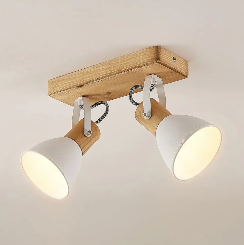 Plafondlamp Merela met 2 spots in Scandinavisch design De 2-lamps plafondlamp Merela tovert een vleugje Scandinavische flair in elke kamer. De baldakijn en de achterkant van de kappen, waarin zich de fitting bevindt, zijn gemaakt van dennenhout, terwijl de kappen en houders zijn gemaakt van mat wit gelakt metaal in een mooi contrast. De twee spotvormige lampen en de houders op de baldakijn kunnen naar wens worden gedraaid en in de houders worden gedraaid om het licht in specifieke gebieden van een kamer te spotten. De 2-lamps plafondspot Merela is daarom bijzonder geschikt voor gangen of woonkamers waar gericht licht nodig is.