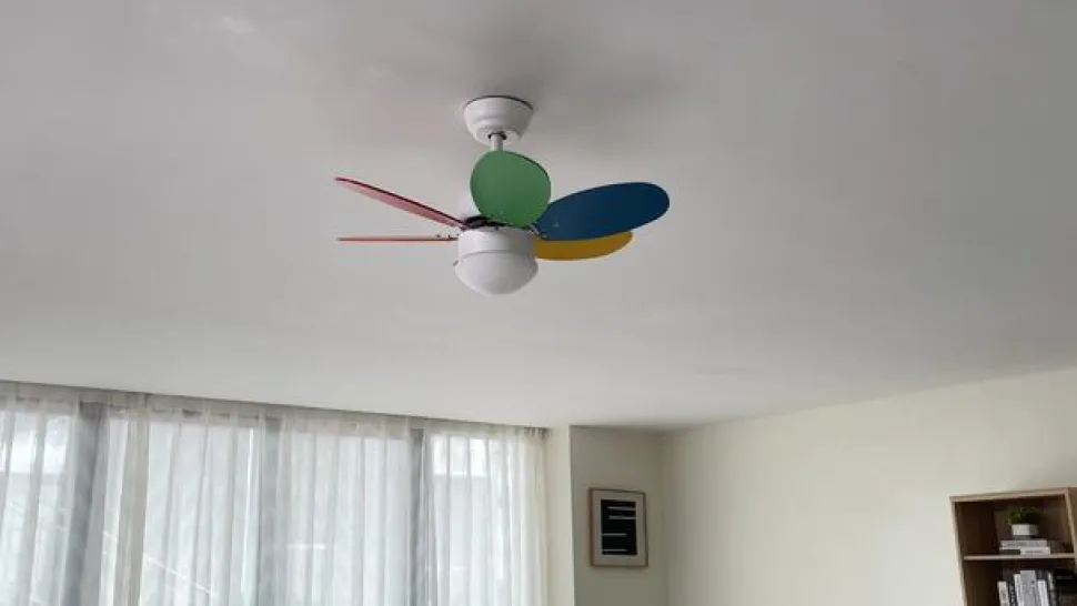 Kleurrijke Litur plafondventilator met E27 fitting Deze kleurrijke Litur plafondventilator is uitgerust met zes multiplex bladen die allemaal schitteren in verschillende felle kleuren. Met de meegeleverde afstandsbediening kun je de snelheid aanpassen en een timer instellen. De geïntegreerde wisselstroommotor garandeert bovendien een stille werking. Litur is geschikt voor gebruik in de zomer. Er kan een E27 lamp in de ventilator worden gestoken voor extra aangename verlichting. De optimale kamergrootte is 9 – 10 m². Technische details Vermogen per snelheid: – 60 watt bij 230 tpm – 35 watt bij 200 tpm – 24,2 watt bij 160 tpm – Maximale luchthoeveelheid: 170 m³/min – Maximale luchtsnelheid: 2,75 m/sec – Geluidsniveau ventilator: 47 dB (A) – Bedrijfswaarde (SV): 4,88 (m³/min)/W – Voor de afstandsbediening zijn 2 x AAA NiCa batterijen nodig